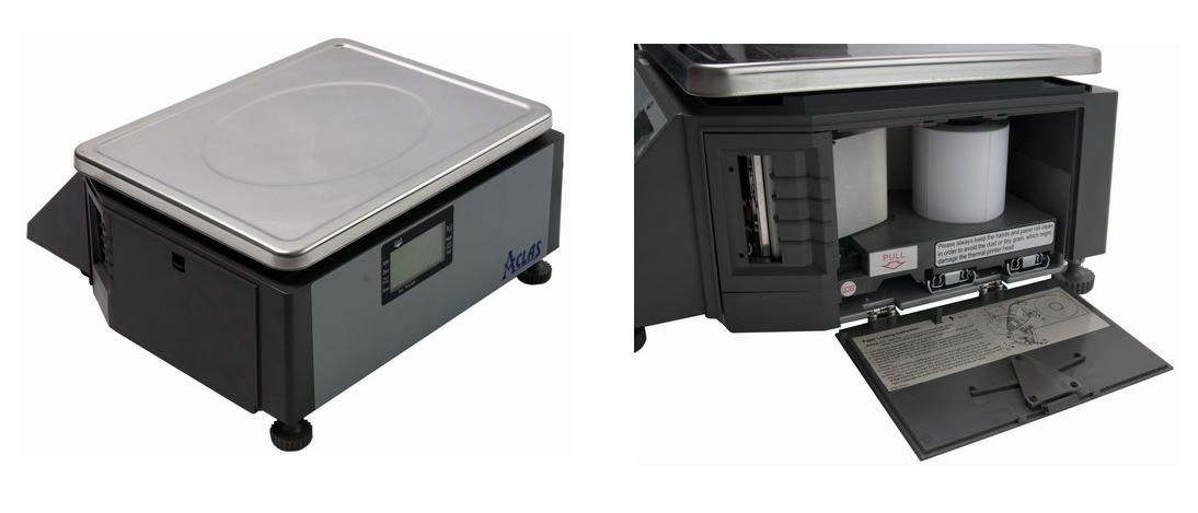 Váha s tiskárnou etiket: Integrovaná termotiskárna s šířkou tisku 56 mm a rychlostí 80 mm/s. Snadná výměna kotouče etiket díky patentovanému výsuvnému mechanismu uložení.