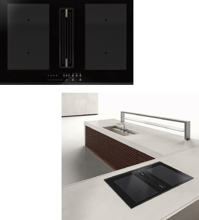 Integrované odsávání: Páry vzniklé při vaření jsou odsávány sací zónou, která je umístěna přímo v centru indukční varné desky. Lamely centrální mřížky jsou skloněny dolů a bezpečně odvedou tekutinu do záchytného prostoru.