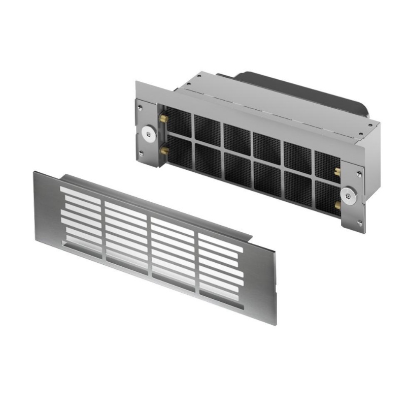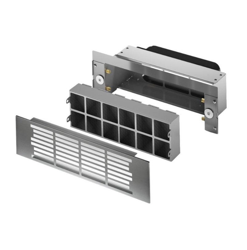 Soklová recirkulační sada Plus KRFH10 je určena pro digestoře produktové řady AirForce Aspira Induction, které pracují v režimu recirkulace bez přímého odtahu mimo místnost. Ventilační jednotka digestoře je umístěna v soklu kuchyňské linky, odsávaný vzduch je odváděn odtahovým potrubím, pročištěn a vrací se zpět do místnosti mřížkou v soklu.