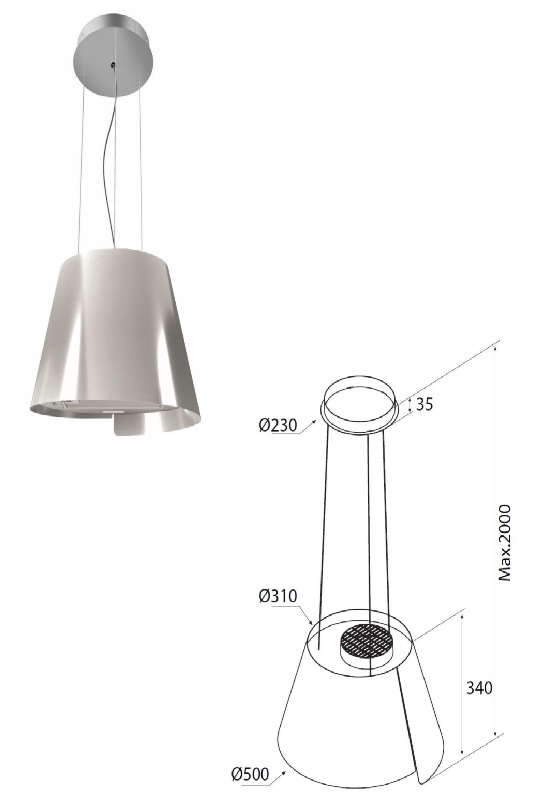 Airforce Sharp IX/F/50 - AKCE | Ostrůvková Závěsná Digestoř 50 cm Nerez | lustrová, pro recirkulaci, AKCE