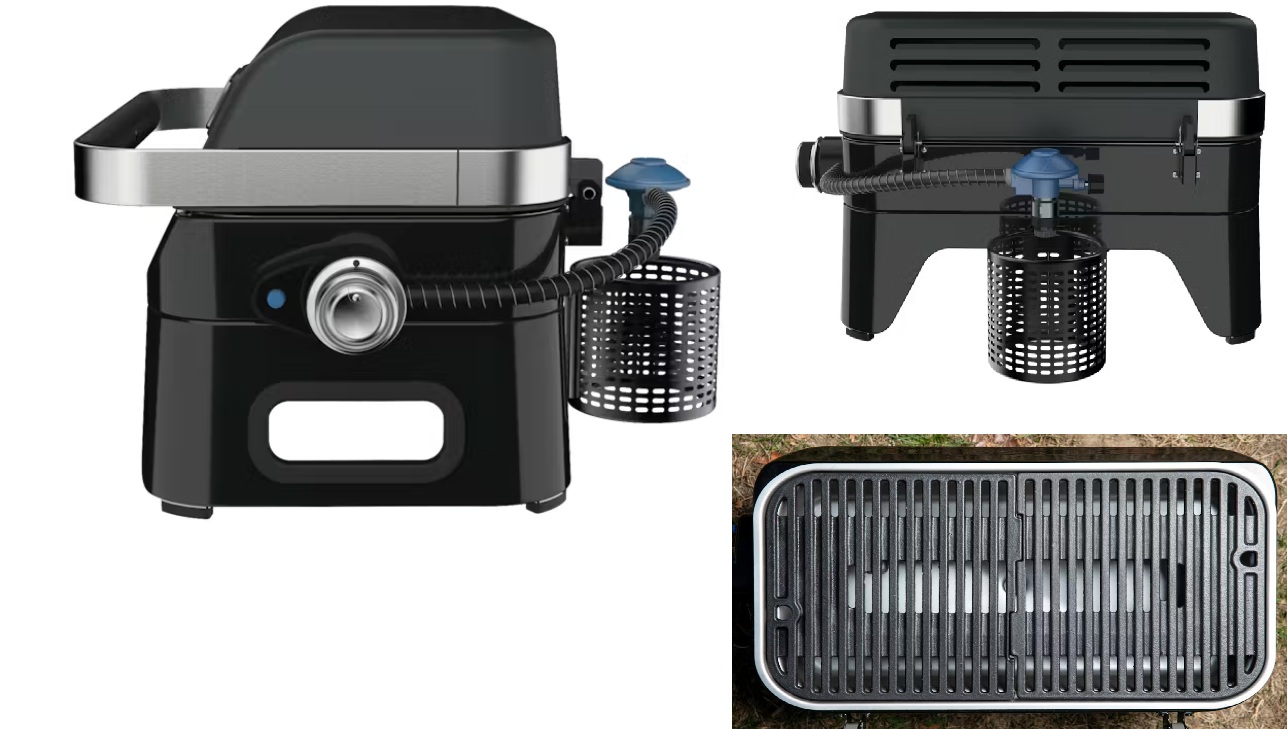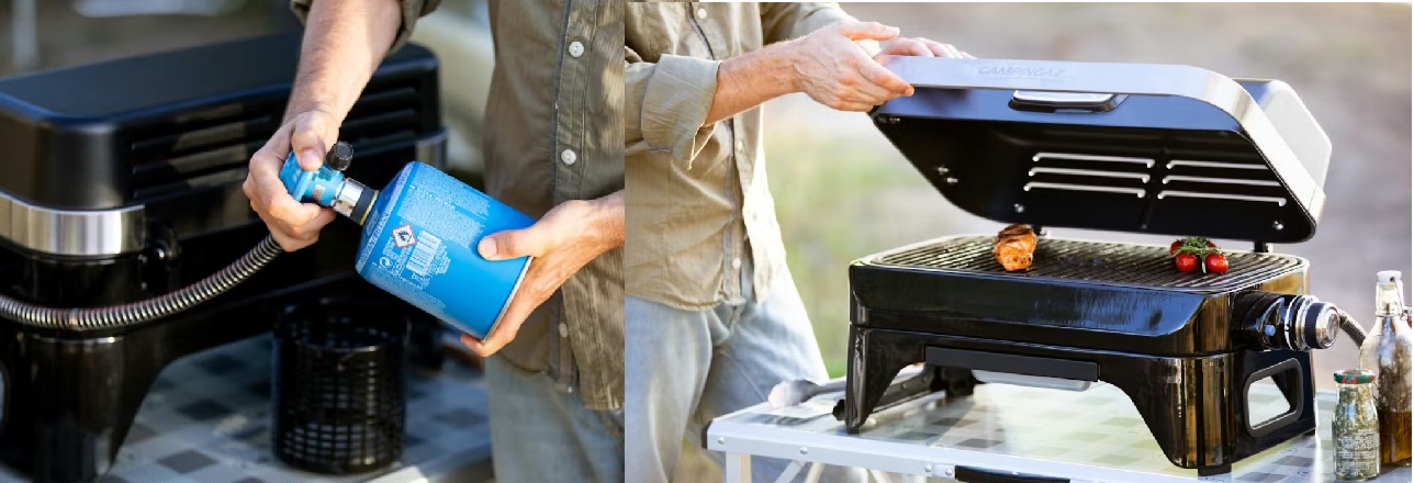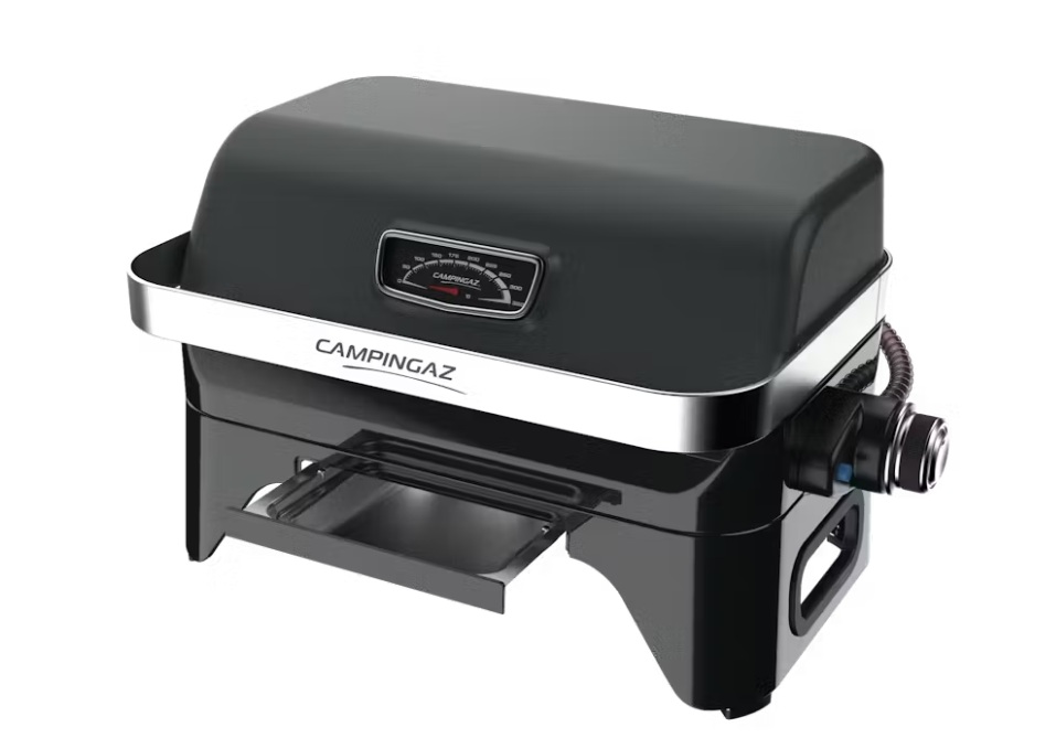 Campingaz Attitude 2go: Stolní plynový gril (2,4 kW). Smaltovaný litinový rošt (1200 cm2), hořák Blue Flame z nerezové oceli, Piezo zapalování. Hliníkové víko s teploměrem, vyjímatelná miska na nečistoty do myčky, dodáváno vcelku. Prodloužená záruka.