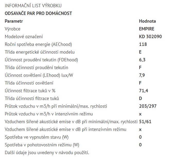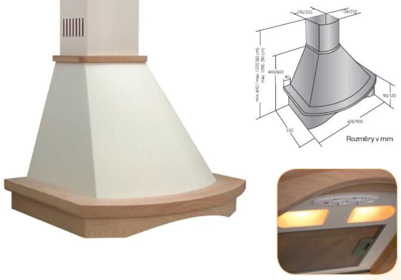 Rustikální bílá komínová digestoř s rámem z nemořeného bukového dřeva - maximální výkon 297 m³/h (15 Pa), 3 rychlosti - hlučnost Lw při max. výkonu je 61 dB(A) - odsávací jednotky mají individuálně vyvažovanou turbínu - motory jsou opatřené vratnými tepelnými pojistkami (při přetížení motoru vypne, po jeho vychladnutí opět sepne) - kovové sendvičové tukové filtry, které lze mýt v myčce - výstupní průměr 120 mm – zdarma zpětná klapka - možnost práce v odtahovém i v recirkulačním režimu
