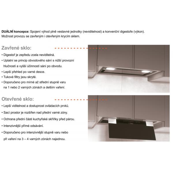 Neviditelná vestavná digestoř, 750 mm (pro 900 mm skříňku), nerez / černé sklo, přehledné a snadno přístupné dotykové (sensorové) ovládání na výklopném spodním panelu, 3 rychlosti, max. výkon 710 m³/h (5 Pa), hlučnost Lw 40 – 67 dB(A), max. tlak 450 Pa, 15 min. časovač, kovové sendvičové tukové filtry, které lze mýt v myčce, výstupní průměr 150 mm, možnost práce v odtahovém i recirkulačním režimu, snadná montáž, Výbava: úsporné LED osvětlení 2 × 4 W s nastavitelnou intenzitou jasu.