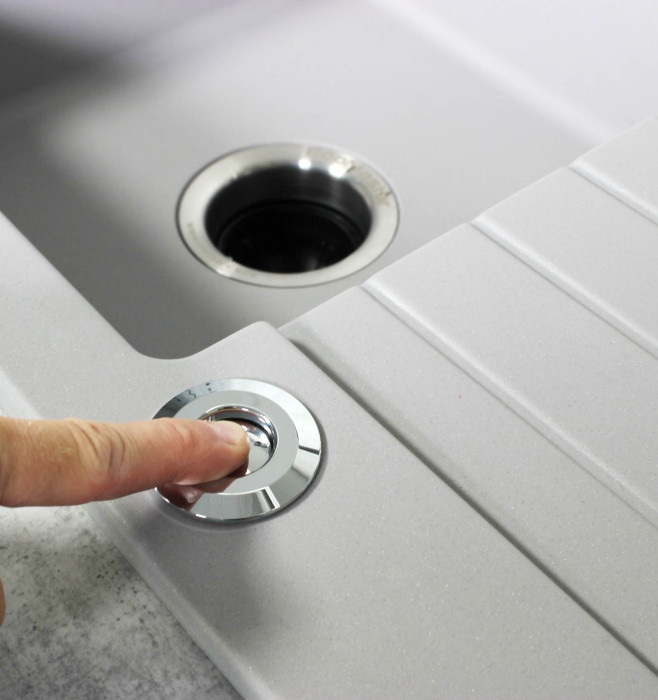 • Pneumatické ovládání (Air Switch): Tlačítko nevede žádný elektrický proud. Funguje na principu tlaku stlačeného vzduchu přes hadičku, který v těle drtiče přepne pneu-mechaniku. Toto řešení zajišťuje maximální bezpečnost a umožňuje umístění tlačítka přímo do vlhkého prostředí (do dřezu nebo pracovní desky, blízko baterie).