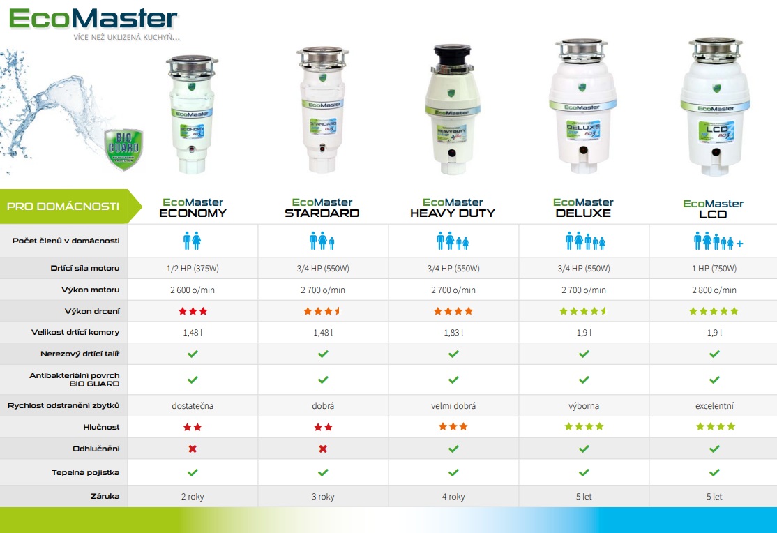 EcoMaster DELUXE EVO3 Drtič kuchyňského odpadu je ideální pro početnější domácnosti nebo malé stravovací zařízení (50 - 200 jídel za den). Všechny drticí komponenty jsou z nerezové oceli, největší drticí komora, odhlučnění komory i motoru.