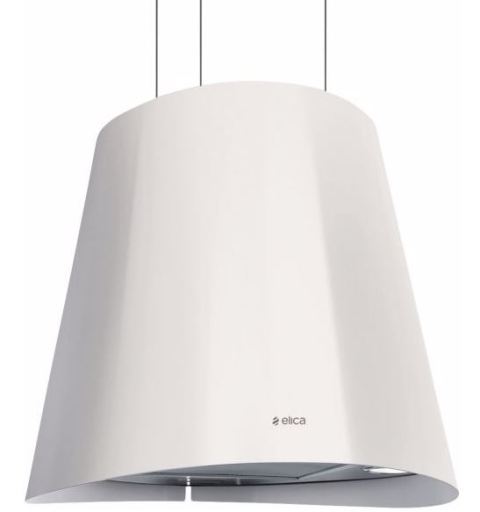 Ostrůvková digestoř závěsná ELICA Juno WH/F 50 Bílá, vyrobená z odolného bílého laku, spojuje moderní design s vysokým výkonem. S výkonem až 620 m³/h si hravě poradí i s intenzivním vařením, a to při překvapivě nízké hlučnosti 45-67 dB(A).