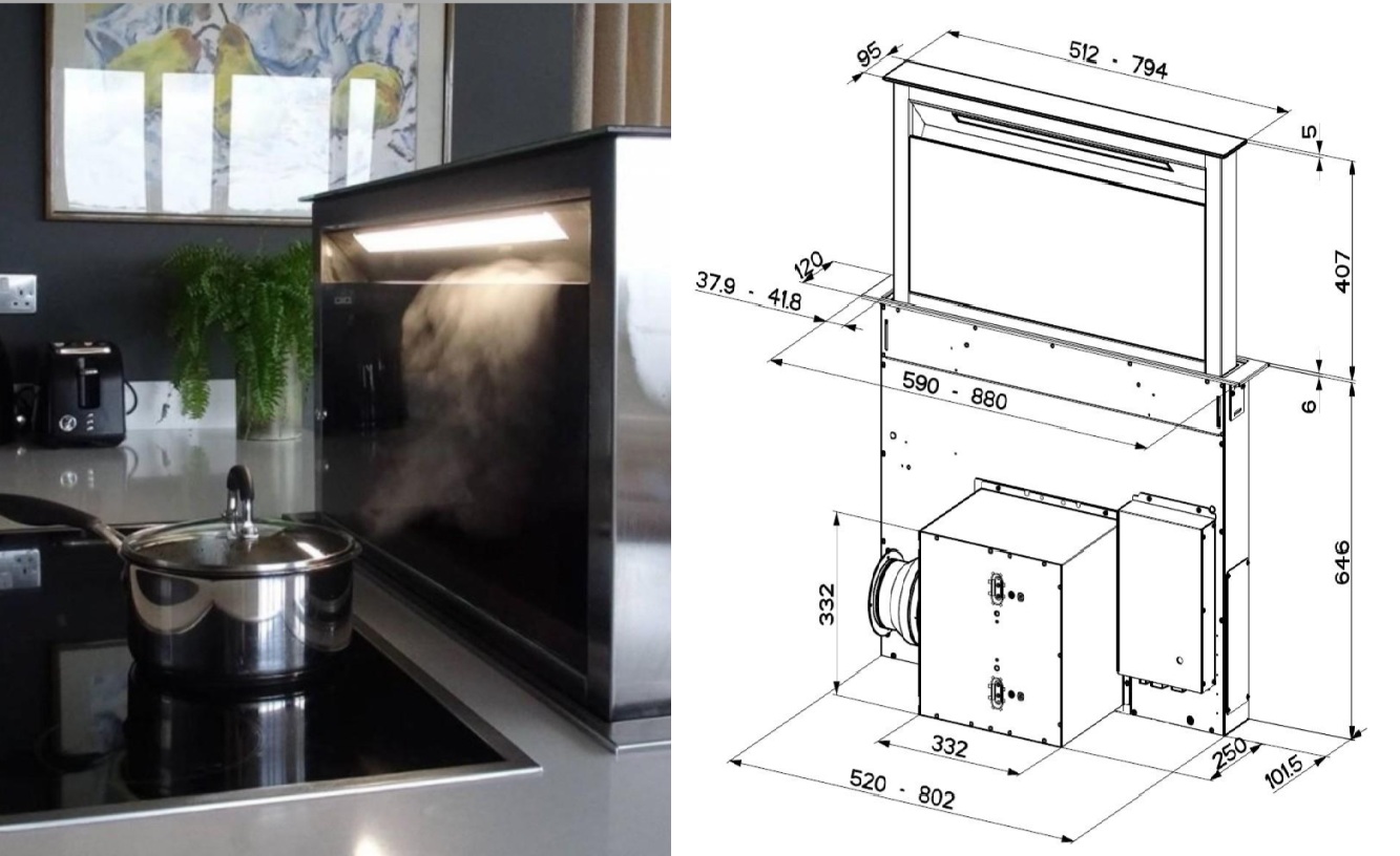 Digestoř se automaticky vysune z pracovní desky při zapnutí a začne odsávat páry a pachy. Díky štěrbinovému sání a výkonnému motoru je zajištěn účinný odvod vzduchu.