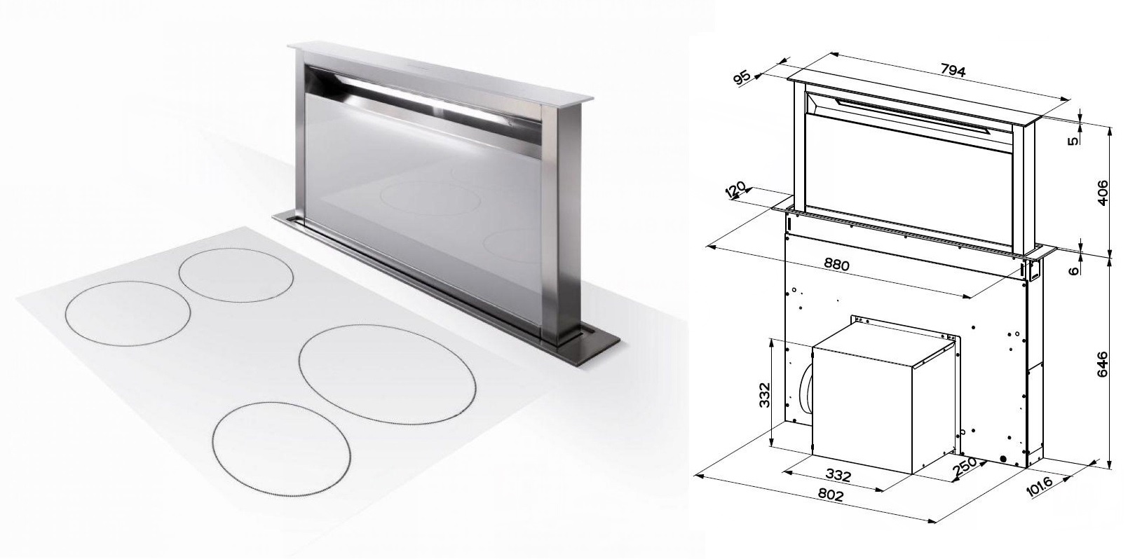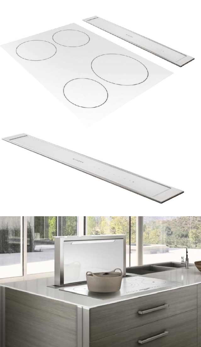 Je určena k instalaci přímo do pracovní desky za varnou plochu. Jakmile ji zapnete, vysune se z pracovní desky sací část a začne odsávat páry a pachy nejen z prostoru nad varnou deskou, ale rovnou z celé kuchyně.