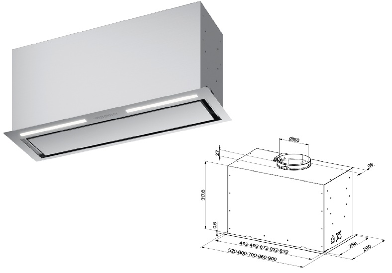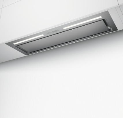 • Design: Sací výkon po obvodu (perimetrální sání) se zúženým profilem, nerezový krycí panel skrývá tukové filtry.