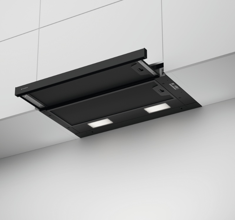 TEKA GFG 2 BK: Celozástavná digestoř v provedení Black Glass, šířka 60 cm. Energetická třída D, dvojitý turbínový motor, 3 rychlosti a tlačítkové ovládání.