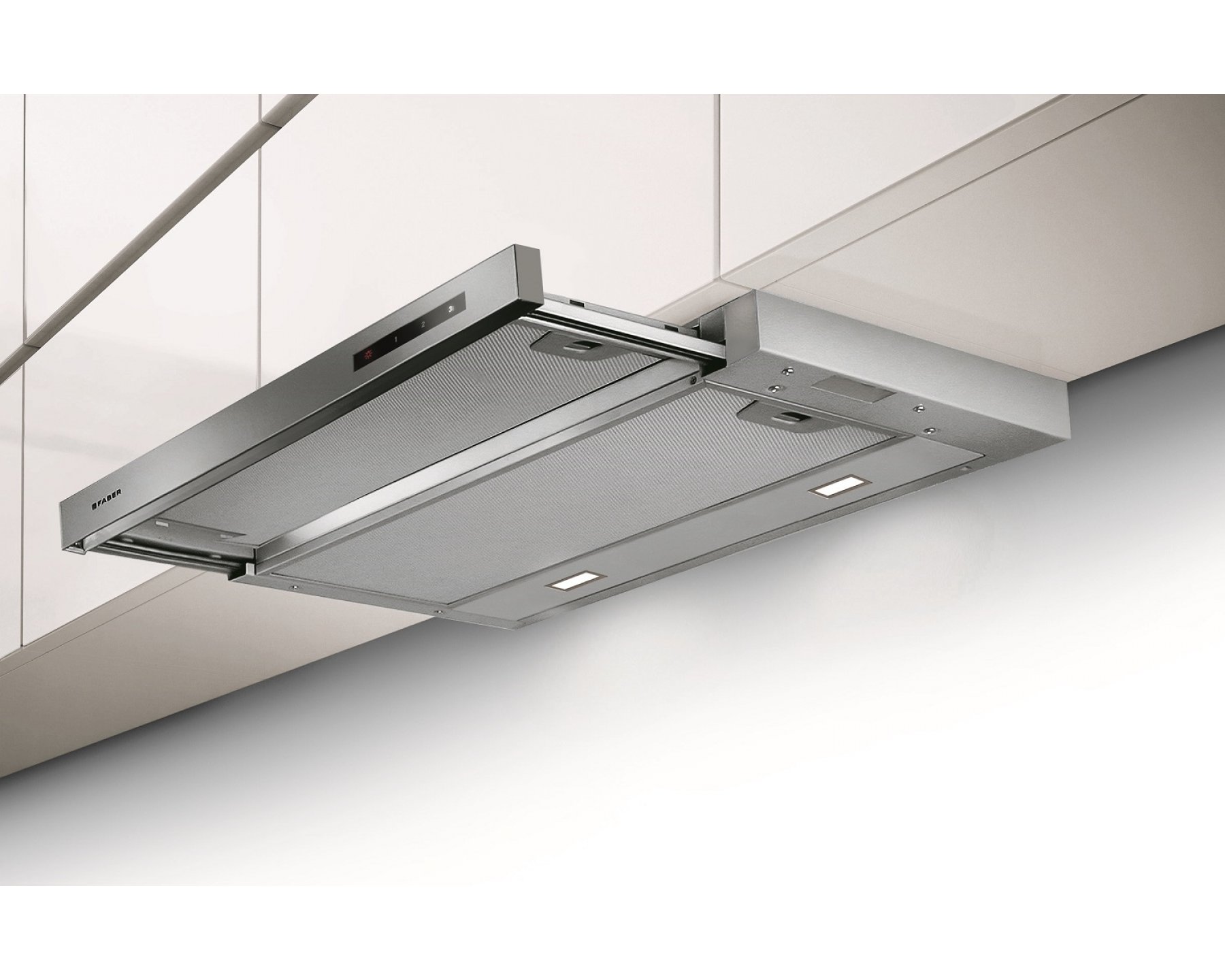 Odsavač nabízí tři stupně výkonu a funkci intenzivního odsávání, které můžete pohodlně ovládat pomocí dotykového ovládání umístěného na výsuvné liště. Zajímavou funkcí je také doběh po ukončení vaření, který zajistí kompletní odvětrání. Po zasunutí lišty se všechny funkce automaticky deaktivují, což přispívá k diskrétnímu vzhledu.