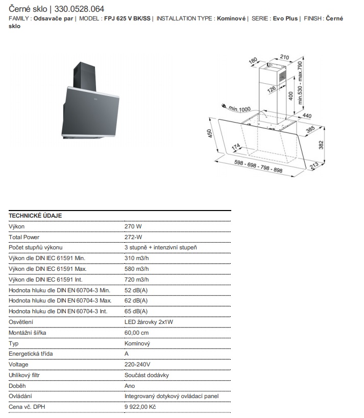 Hledáte elegantní a vysoce výkonný odsavač par pro vaši moderní kuchyni s omezeným prostorem? Šikmý komínový odsavač par FRANKE FPJ 625 V BK/SS Evo Plus v provedení z černého skla (RAL 9005) s nerezovými proužky je vynikající volbou. Nabízí moderní senzorové ovládání, štěrbinové odsávání a tichý provoz díky technologii Sound Pro. Černý teleskopický komínek je součástí balení.