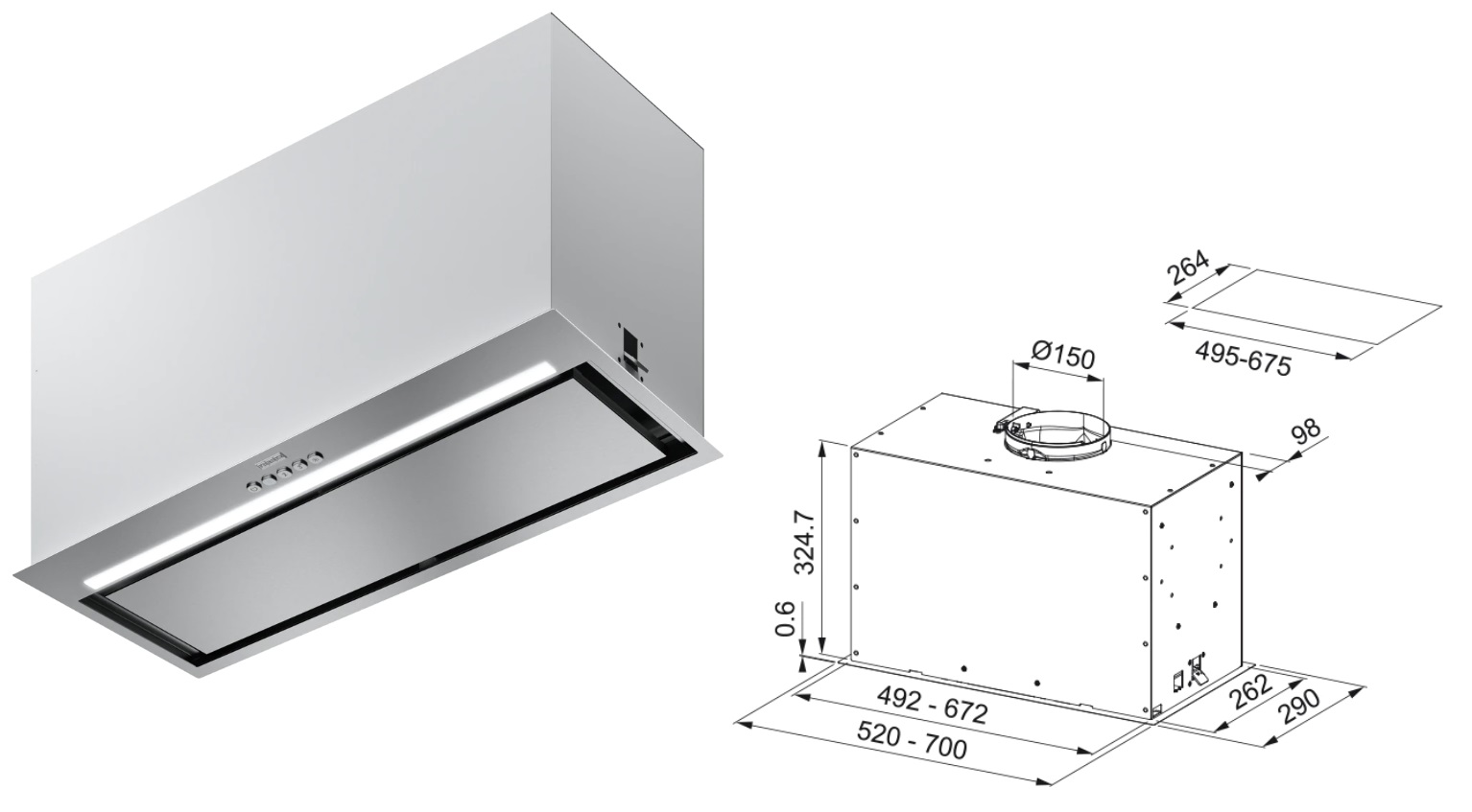 Vestavný odsavač par Box Evo. Provedení nerez. Energetická třída B. Tlačítkové ovládání. Štěrbinové odsávání. 3 Stupně výkonu, Intenzivní stupeň.