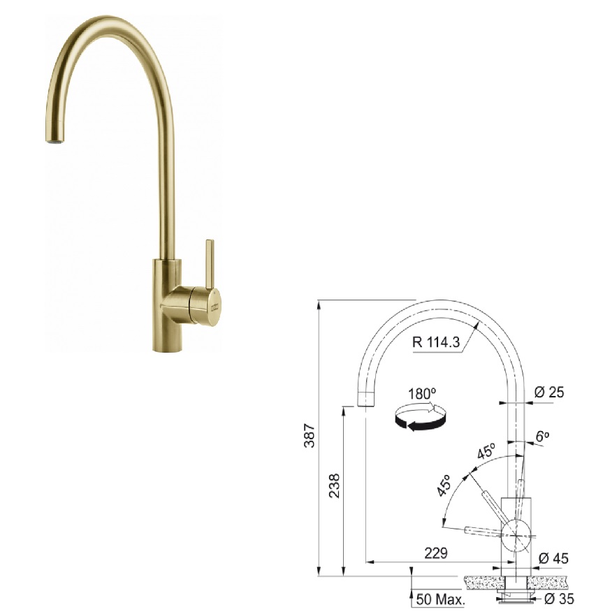 Její oblé ramínko a precizní zpracování z celonerezu 304 s PVD povrchovou úpravou ve zlaté barvě z ní činí exkluzivní a sofistikovaný prvek vaší kuchyně.