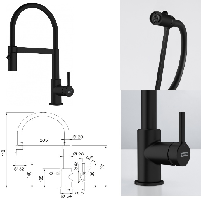 FRANKE FC 2583.901 LINA SEMI PRO je designová dřezová baterie z řady Smart s profesionálním vzhledem, která se vyznačuje provedením Matná černá. Díky pružinové koncovce je ideální pro intenzivní mytí a plnou flexibilitu u dřezu.