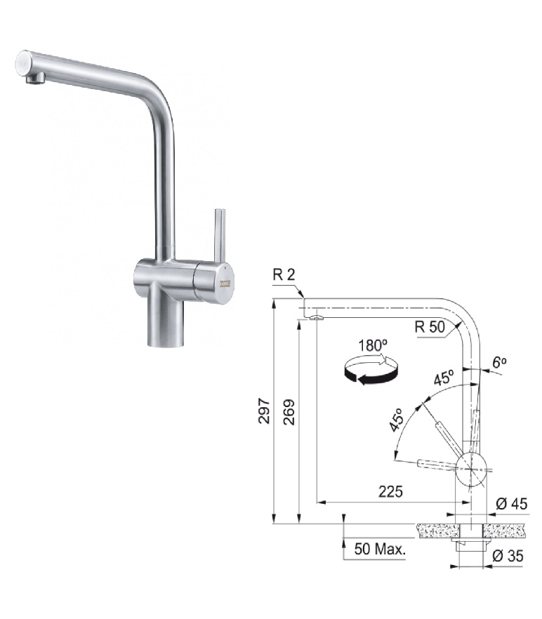 Otočná 180°. Připojení Hadičky 45 cm. Průtok vody 12,2 l/min. (3 bar). Laminární průtok vody. Není vhodná pro montáž do nerezových dřezů.