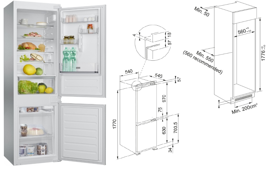 TEKA RBF 73355 FI: Vestavná kombinovaná chladnička (178 cm). Třída E, velmi tichý provoz (35 dB). Objem 248 l (180/68 l). Má Fresh Box, 4 skleněné police a kapacitu pro 3 láhve. Vnitřní ovládací displej, rychlé chlazení/mrazení.