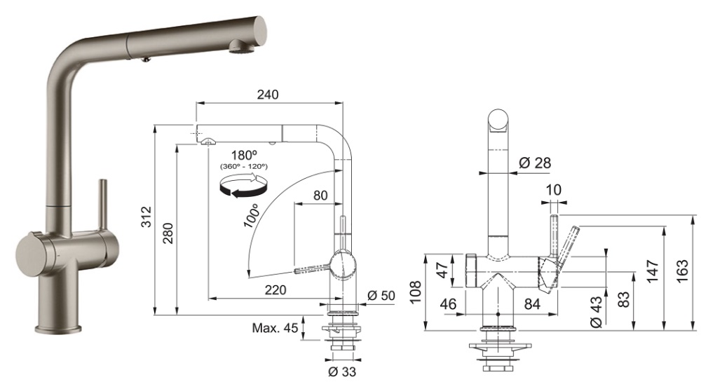 • Otočná o 180°: Pro flexibilní použití a snadné mytí dřezu.