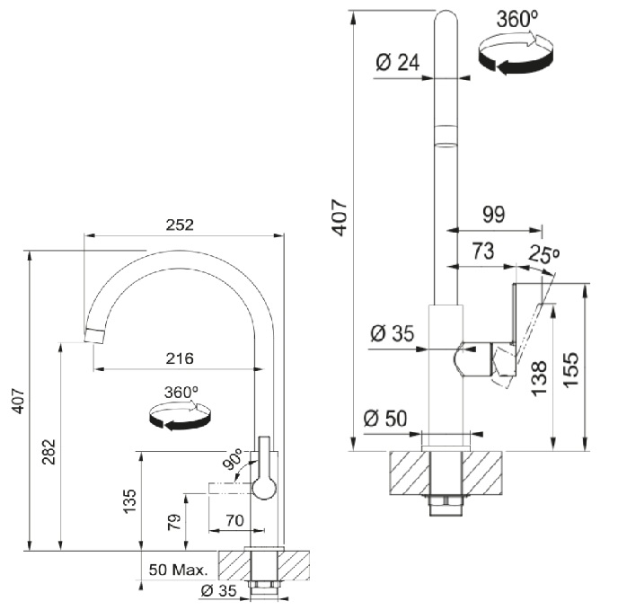 • Ramínko: Plně otočné o 360°, což poskytuje maximální flexibilitu pro jakýkoli dřez.