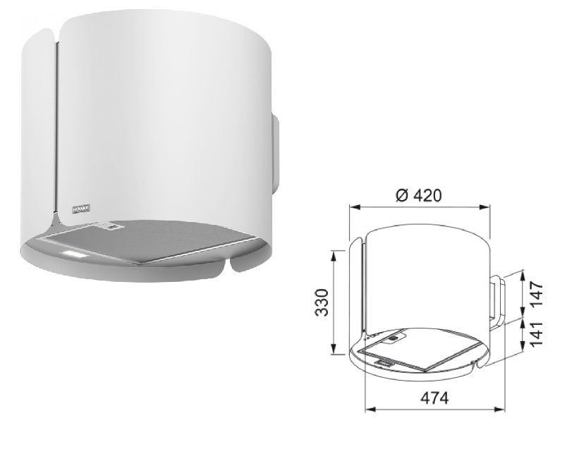 • Průměr vyústění odtahu: 150 mm (I přes to, že je pouze recirkulace, rozměr je uveden).