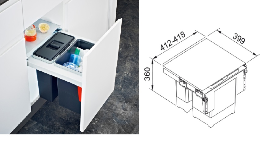 FRANKE Garbo 45-2 je kompaktní odpadkový třídící systém, navržený pro efektivní využití prostoru ve skříňce o šířce 45 cm. Systém využívá čelní výsuv a je kompletně vybaven tlumeným plnovýsuvem.