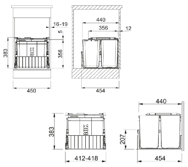 • Typ instalace: Čelní výsuv (montáž do dna skříňky).