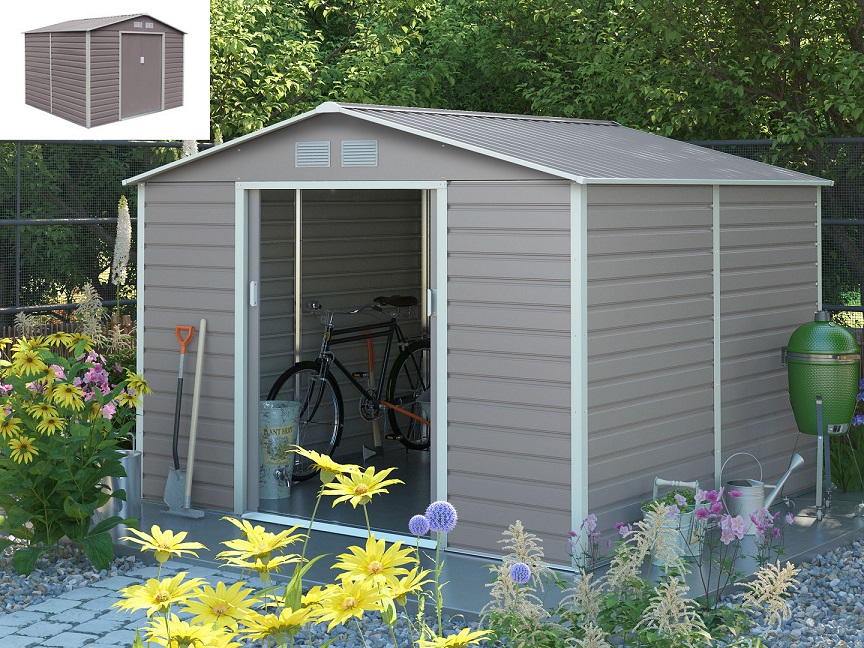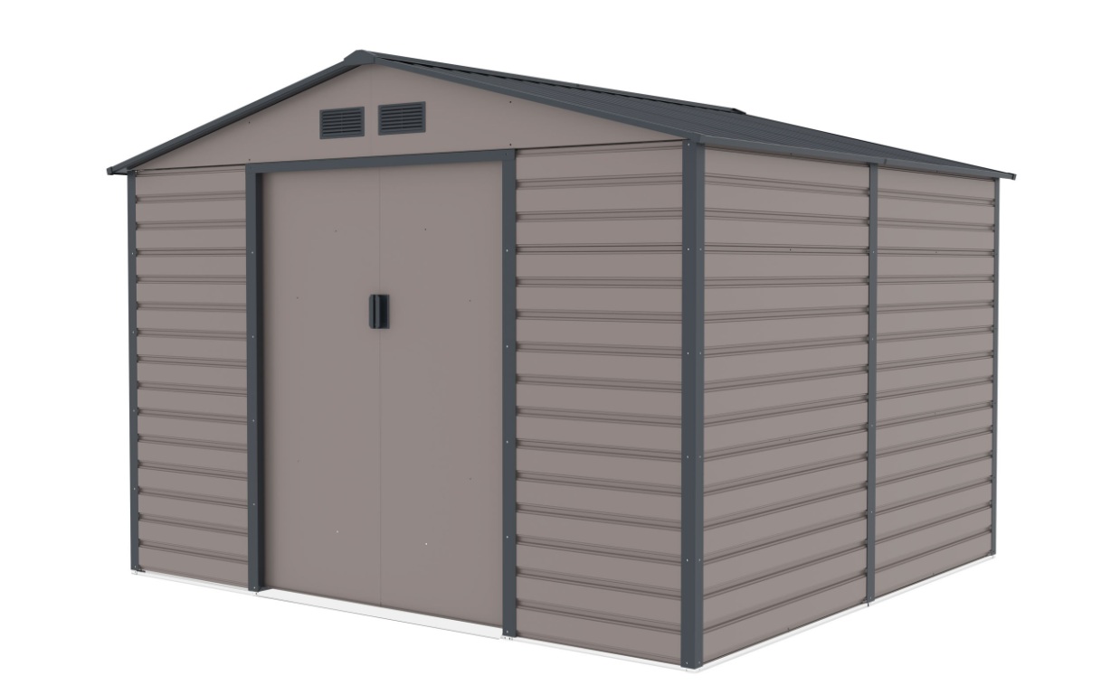 G21 GRAH 700: Hnědý zahradní domek (340x206 cm) z bezúdržbového plechu. S 10letou zárukou proti prorezivění, pozinkovanou konstrukcí a širokými dvoukřídlými dveřmi. Ideální úložné řešení pro zahradu za výhodnou cenu.