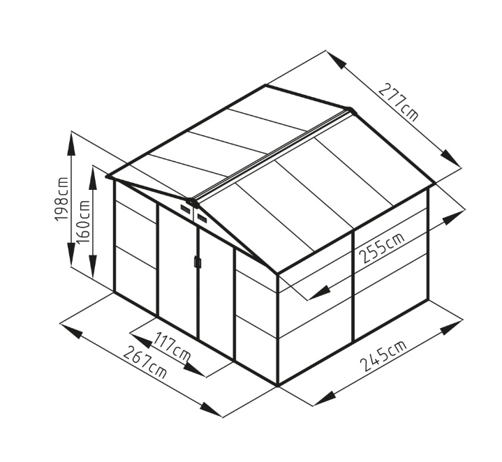 • Vnější rozměry – se střechou (š x d x v): 277 x 255 x 198 cm