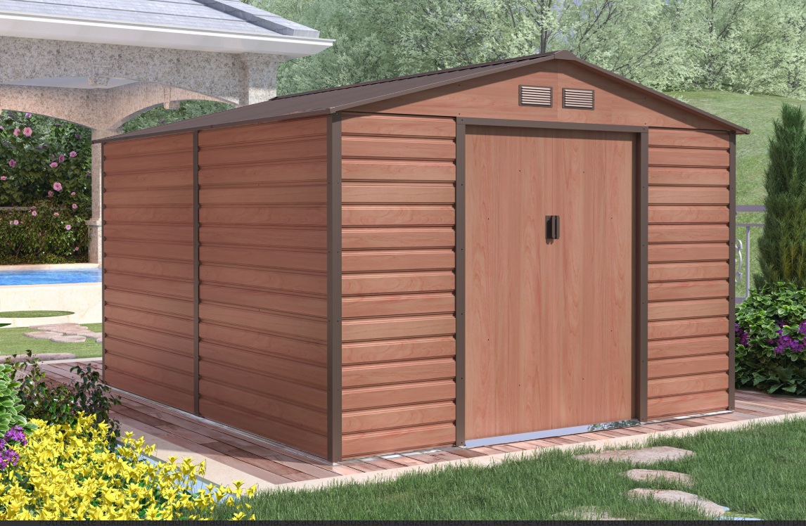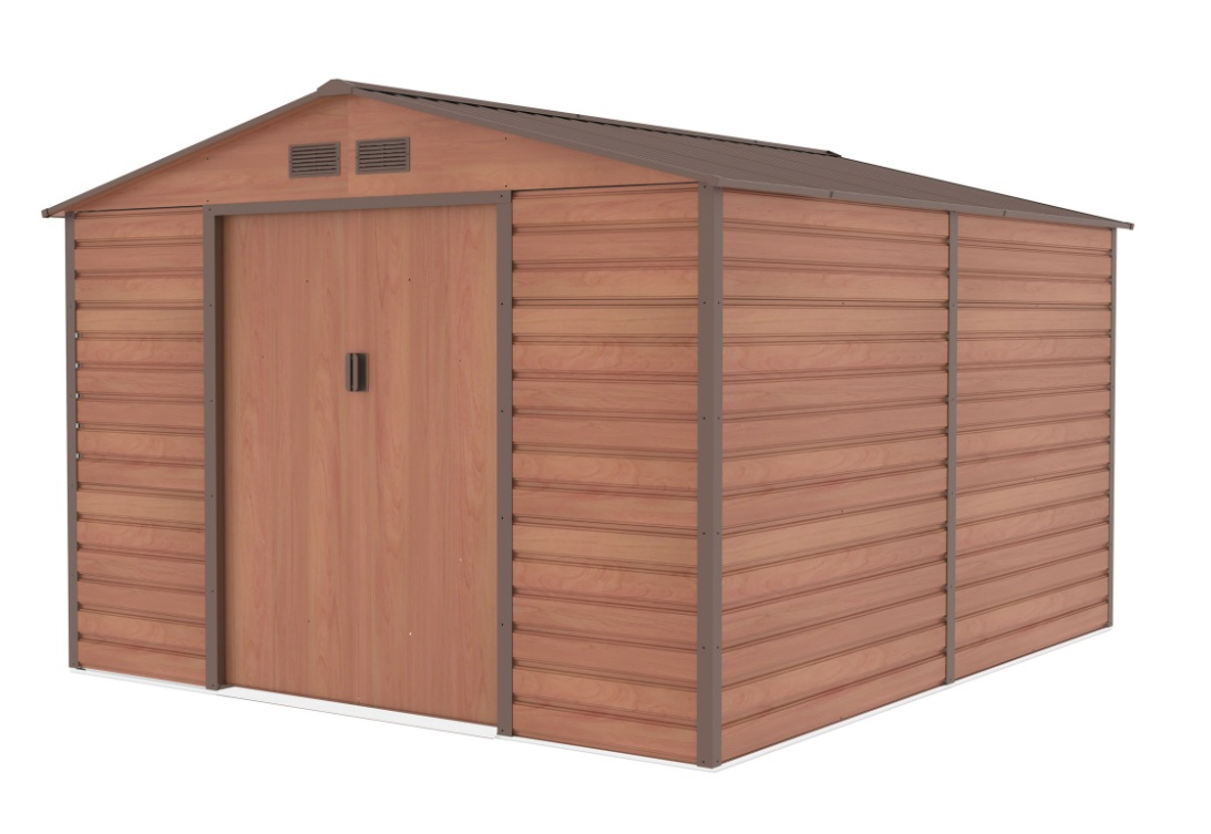 G21 GRAH 700: Hnědý zahradní domek (340x206 cm) z bezúdržbového plechu. S 10letou zárukou proti prorezivění, pozinkovanou konstrukcí a širokými dvoukřídlými dveřmi. Ideální úložné řešení pro zahradu za výhodnou cenu.
