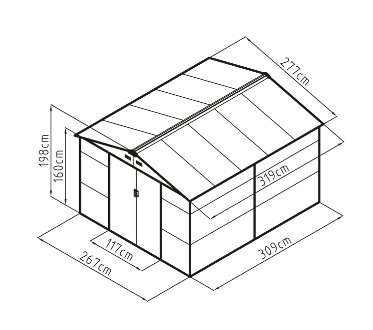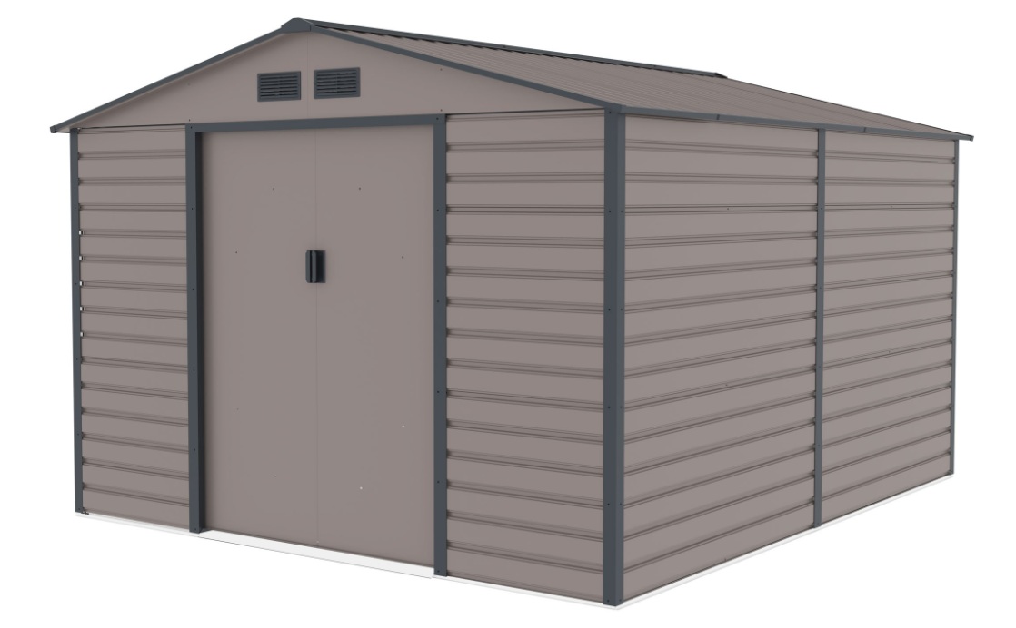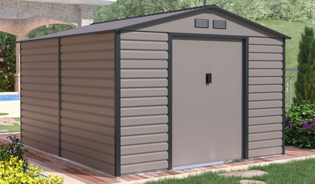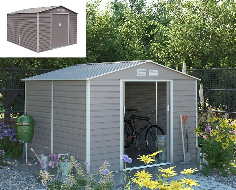 G21 GRAH 700: Hnědý zahradní domek (340x206 cm) z bezúdržbového plechu. S 10letou zárukou proti prorezivění, pozinkovanou konstrukcí a širokými dvoukřídlými dveřmi. Ideální úložné řešení pro zahradu za výhodnou cenu.