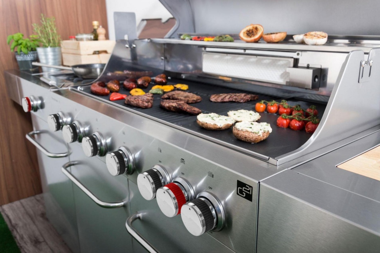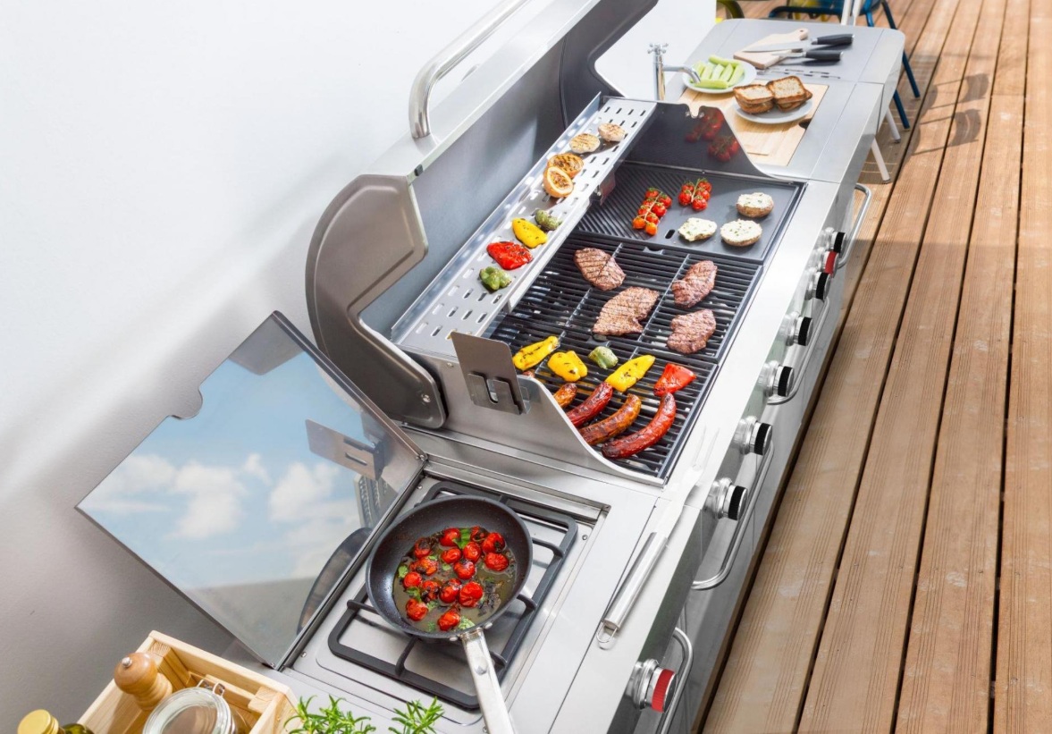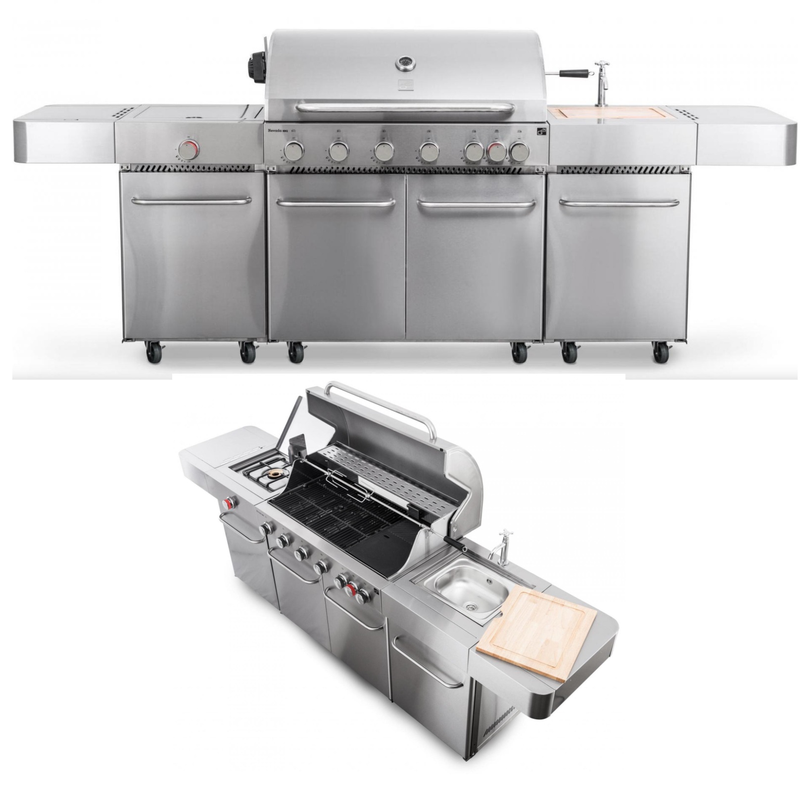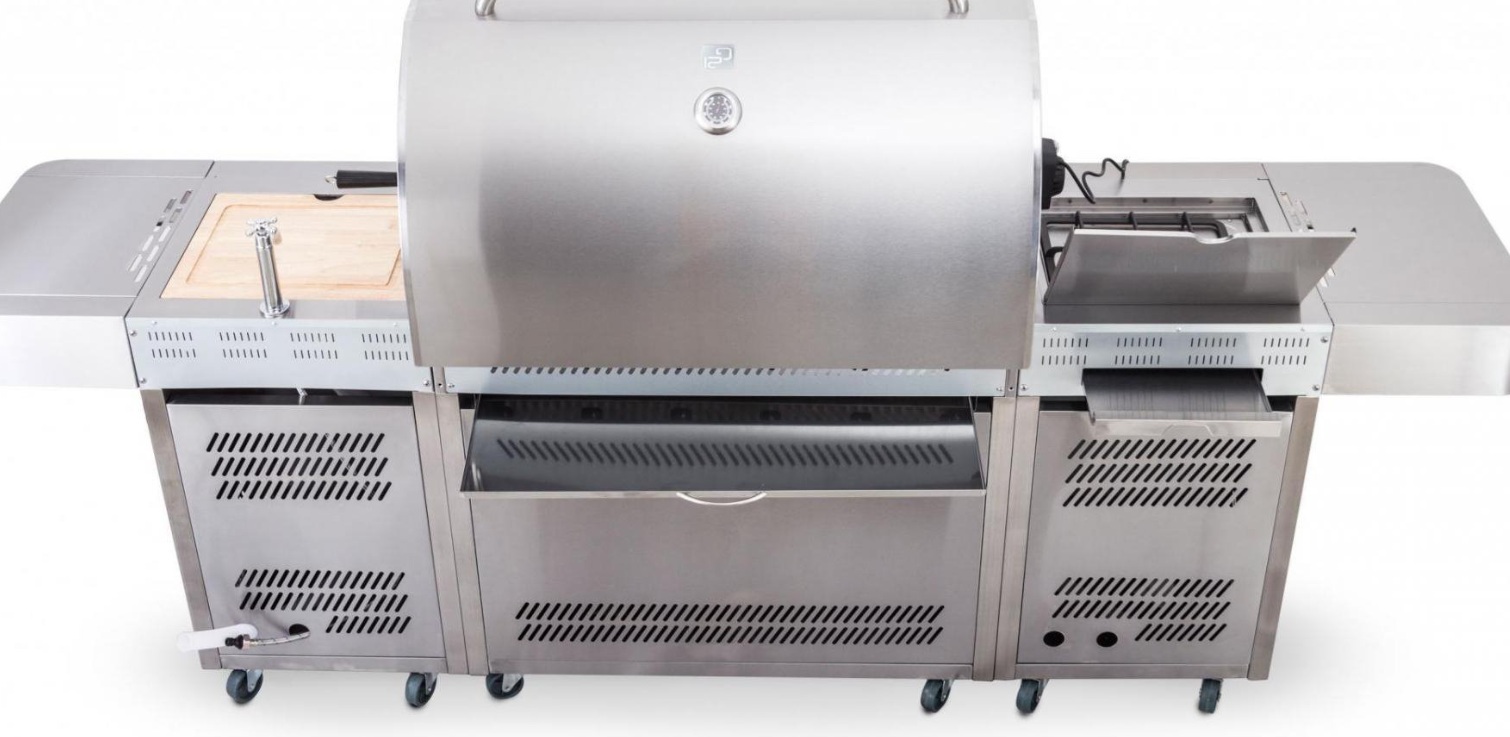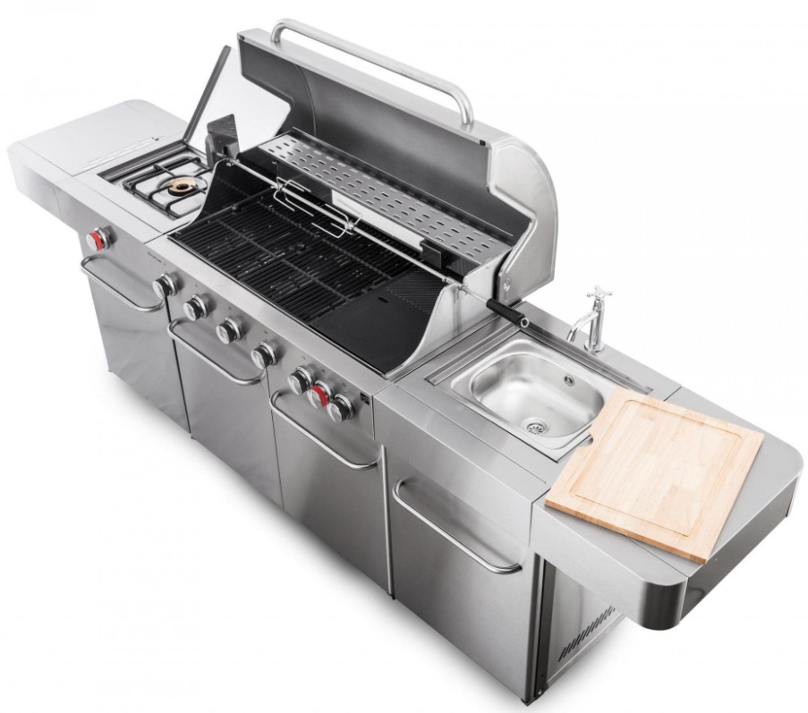 je kompletní zahradní kuchyně, která splňuje přání i těch nejnáročnějších šéfkuchařů a milovníků grilování. S neuvěřitelnými osmi hořáky, vestavěným dřezem s krájecím prkénkem, obrovskou pracovní plochou a chytře řešenými odkládacími prostory představuje dokonalé řešení pro venkovní přípravu pokrmů.