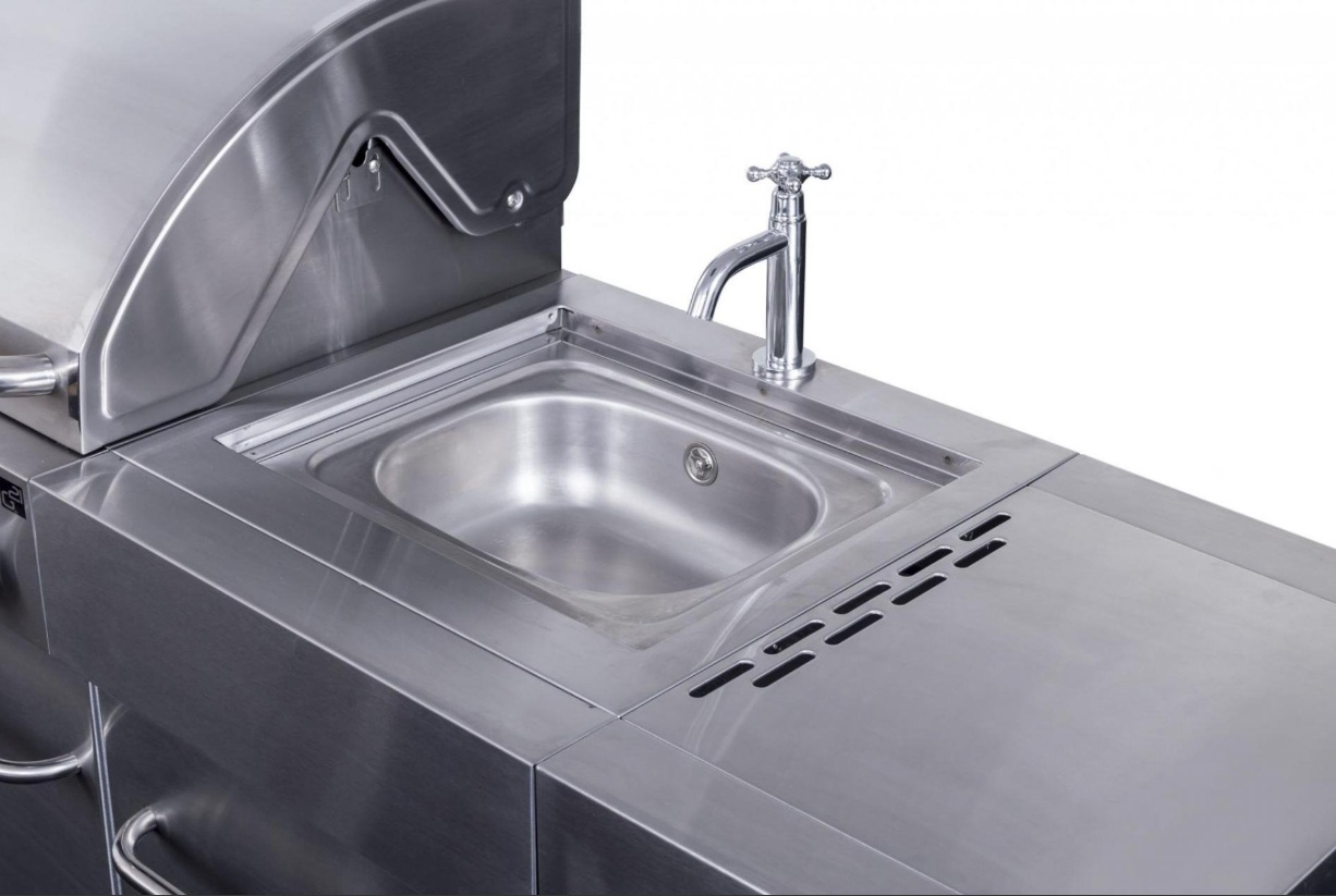 • Vestavěný dřez s víkem/krájecím prkénkem: Součástí grilu je praktický dřez s přívodem na vodu ze zahradní hadice, který umožňuje pohodlné oplachování nádobí přímo při grilování. Víko dřezu slouží zároveň jako krájecí prkénko, čímž maximalizuje využitelnou pracovní plochu.