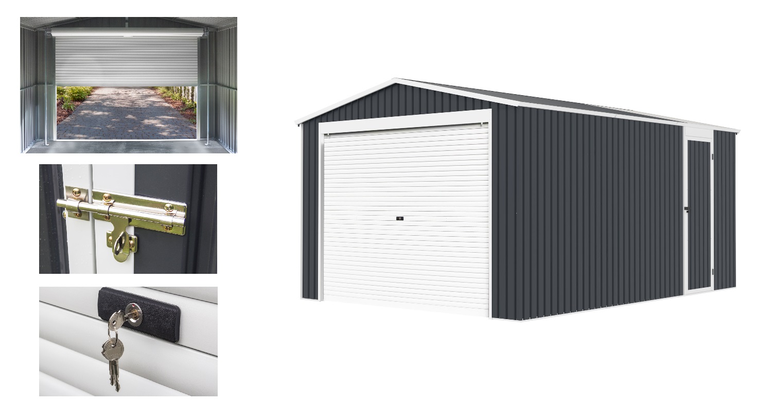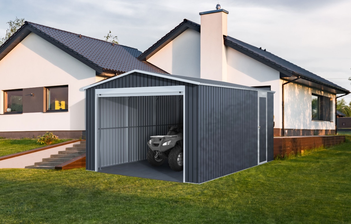 G21 Portland 1950: Rychlá a cenově dostupná montovaná plechová garáž (19,5 m2) v antracitové barvě. Roletová vrata, boční dveře, stabilní konstrukce. Odolný pozinkovaný plech, záruka 10 let proti prorezivění.