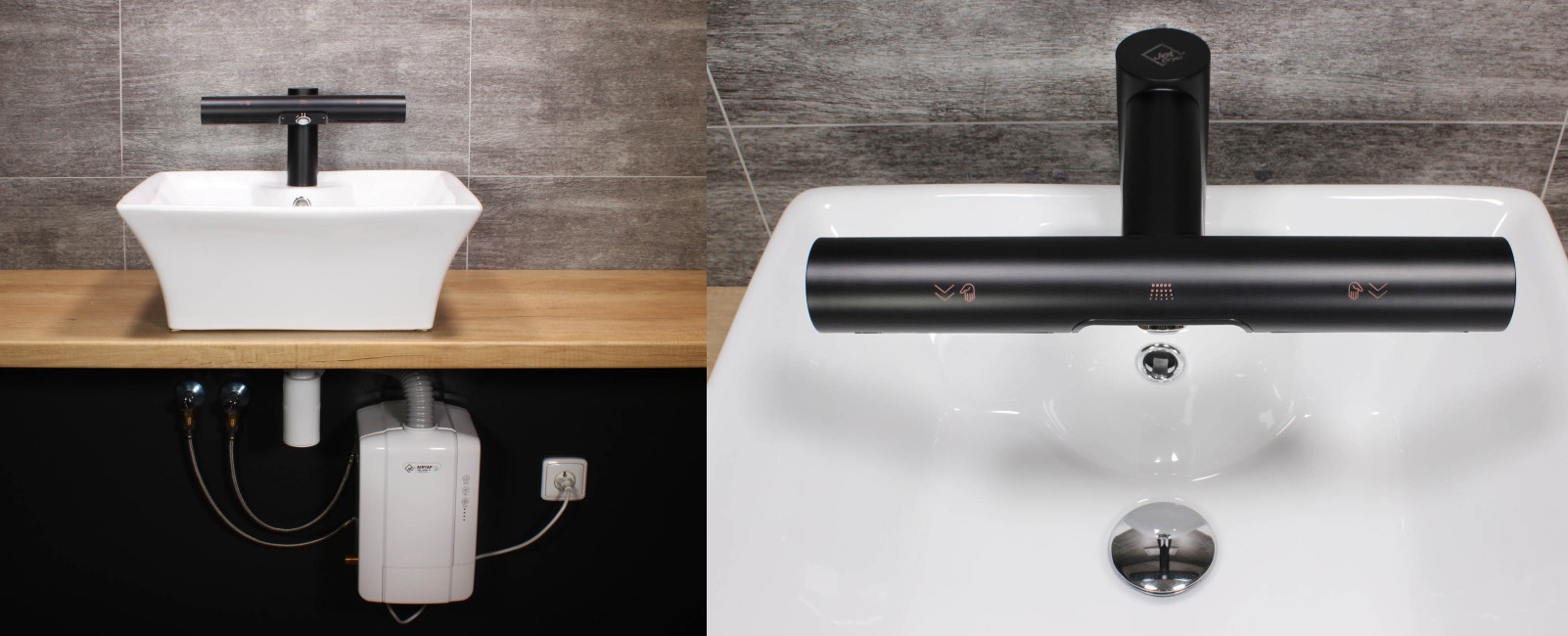 Hygienické umytí a osušení rukou nebylo nikdy jednodušší. Vložením rukou pod vodovodní baterii začne automaticky téct voda o předem nastavené teplotě. Uprostřed automatické baterie se nachází vyústění trysky vysoušeče. Spuštění je také bezkontaktní, stačí vsunout ruce a pohybovat s nimi podobně jako při mytí.