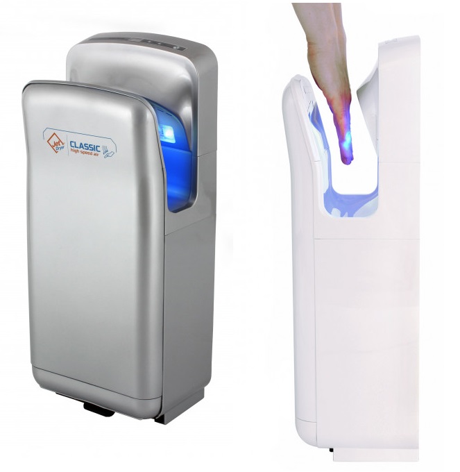 Rychlý a výkonný tryskový vysoušeč rukou Jet Dryer CLASSIC vysuší vaše mokré ruce během 10 sekund. Bezdotykový vysoušeč rukou se hodí zejména na toalety a všude tam, kde je potřeba dokonale osušit vlhké ruce. Díky podélným tryskám rozmístěným po obou stranách Jet Dryer vysuší dlaně teplým vzduchem během okamžiku. Hepa filtrace a antibakteriální povrch zaručuje vysoký stupeň hygieny. Systém Dry Floor zajistí vždy dokonale suchou podlahu.