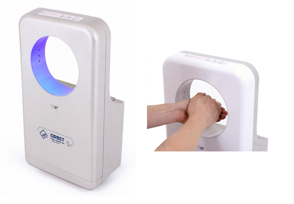 Kruhový design, absorpční kámen a možnost použití na toaletách pro hendikepované, dělají z Jet Dryer ORBIT naprosto jedinečný vysoušeč. Ruce jsou díky tornádo efektu suché do sedmi sekund. Díky tomu, že se instaluje výše, než ostatní tryskové vysoušeče, můžete jej dobře využít i na prostorově atypických umývárnách. Stejně jako ostatní vysoušeče, vám Jet Dryer ORBIT pomůže snížit provozní náklady, a navíc chráníte přírodu.
