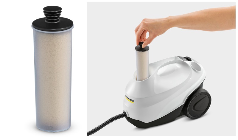 Odvápňovací patrona chrání technologii uvnitř parního čističe před usazováním vodního kamene a zajišťuje tak dlouhou životnost zařízení. Odvápňovací kazeta se snadno používá a vyměňuje.