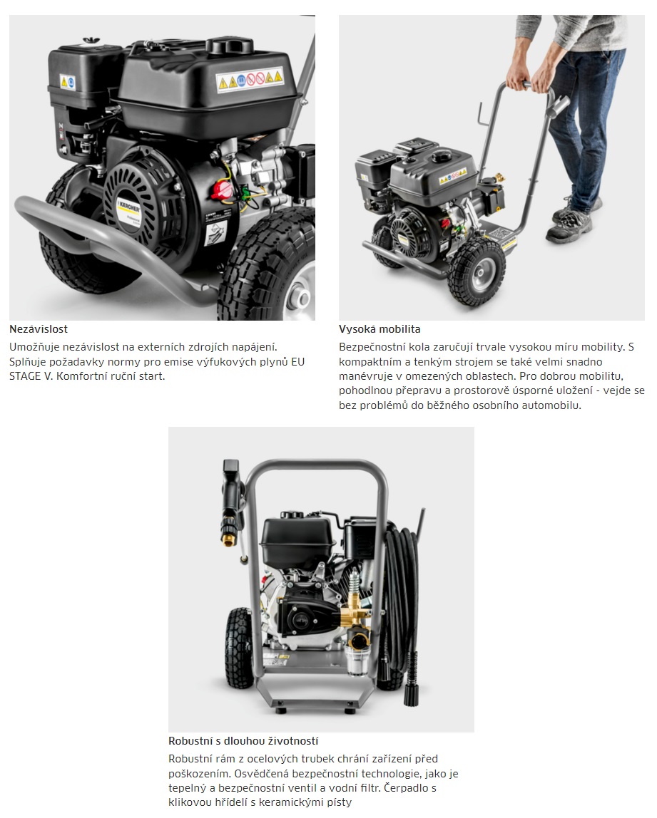 Robustní rám z ocelových trubek chrání zařízení před poškozením. Osvědčená bezpečnostní technologie, jako je tepelný a bezpečnostní ventil a vodní filtr. Čerpadlo s klikovou hřídelí s keramickými písty.