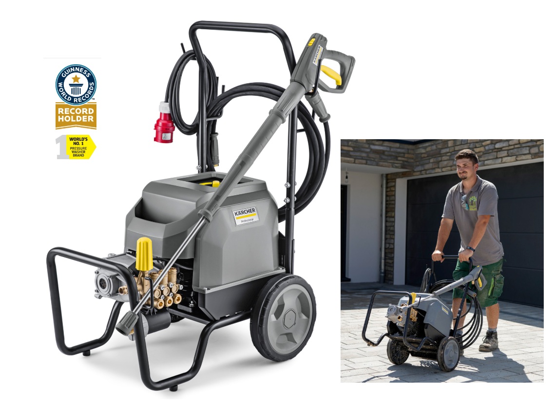 KÄRCHER HD 5/15 CX Plus + FR Classic: Průmyslový vysokotlaký čistič pro stroje a zařízení s tlakem 150 bar pro napětí 230 V. Obsahuje rotační kartáč na dlažbu a buben s 15m VT hadicí.