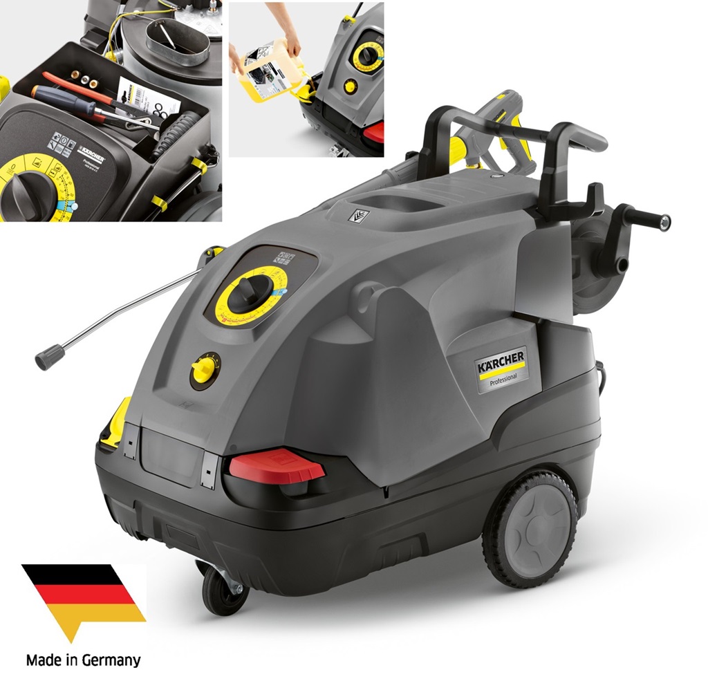 Průmyslový vysokotlaký čistič s ohřevem vody KÄRCHER HDS 10/21-4 M 1.071-939.0 s tlakem 210 bar je výkonný vysokotlaký čistič s ohřevem se 4pólovým vodou chlazeným elektromotorem, úsporným režimem eco!efficiency a 2 nádržkami na čisticí prostřed