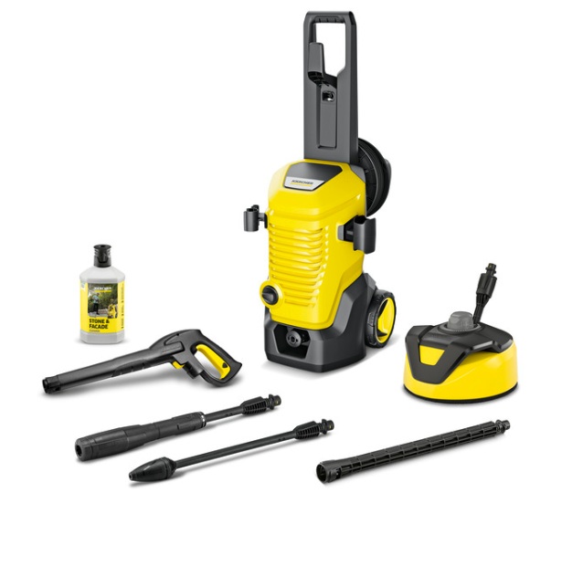• Sada Home Kit: Obsahuje plošný čistič T 5 a 1 litr prostředku na kámen, což umožňuje rychlé mytí teras a cest bez stříkající vody.