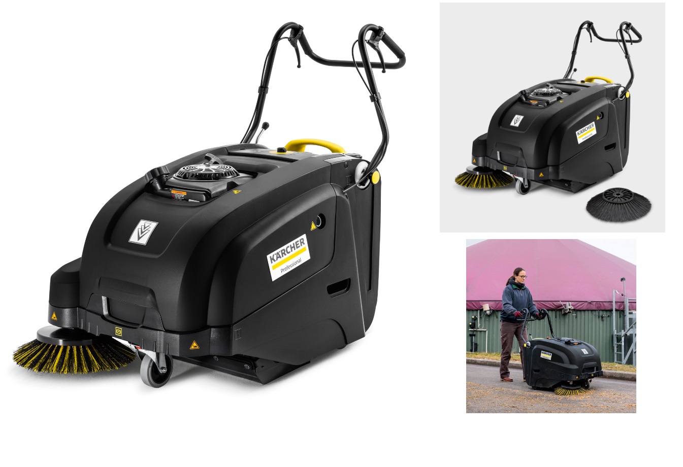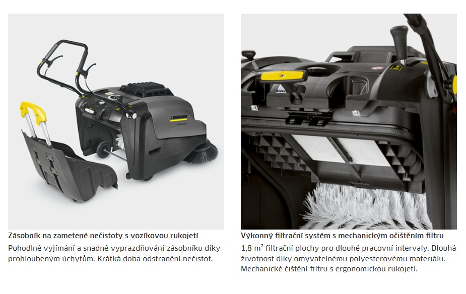 KÄRCHER KM 75/40 W G Motorový profesionální zametací stroj je s odsáváním pro čerpací stanice, úklid tartanu, parkovacích ploch, obsahuje zásobník na zametené nečistoty s vozíkovou rukojetí .