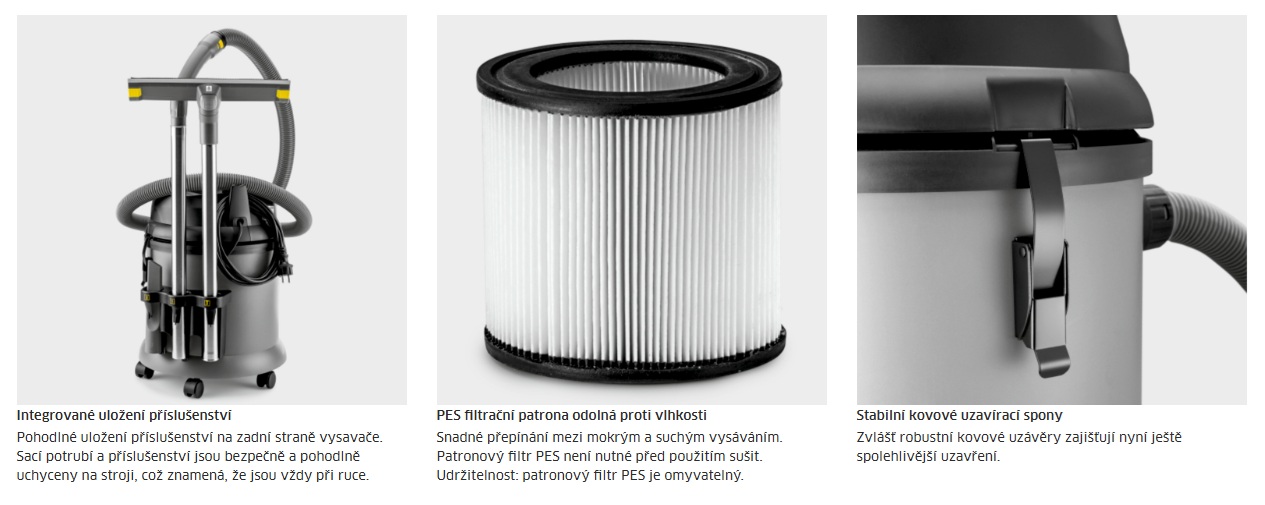 • Filtrační patrona: Velká filtrační kazeta PES vhodná pro suché i mokré vysávání; součástí je také jeden papírový filtrační sáček.