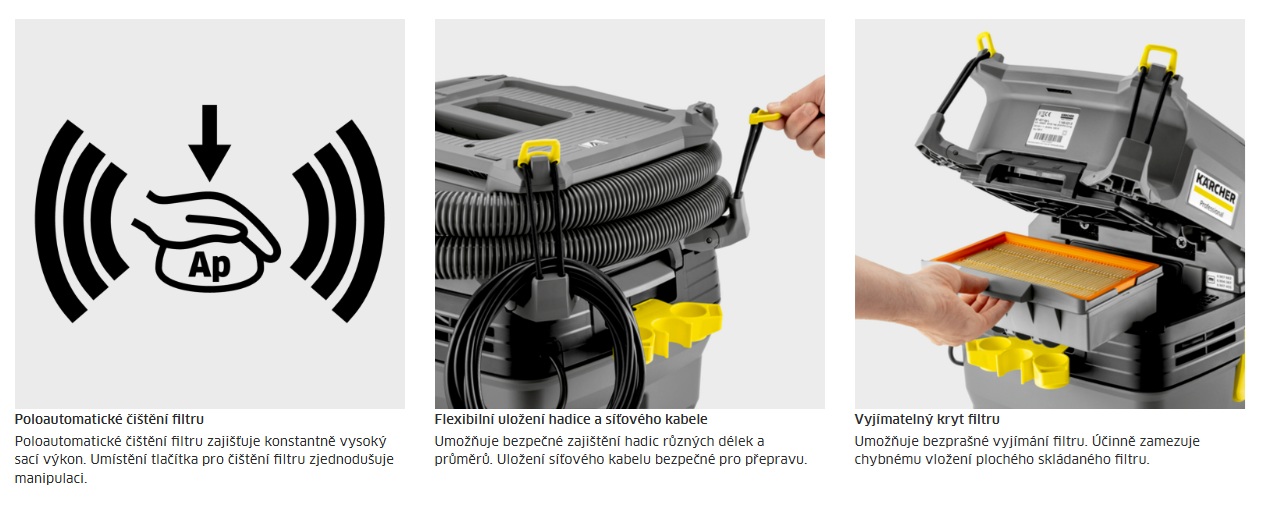 • Poloautomatické čištění filtru Ap: Funkce čištění filtru stisknutím tlačítka umožňuje udržet konstantně vysoký sací výkon a pracovat po dlouhou dobu bez zbytečných přestávek.