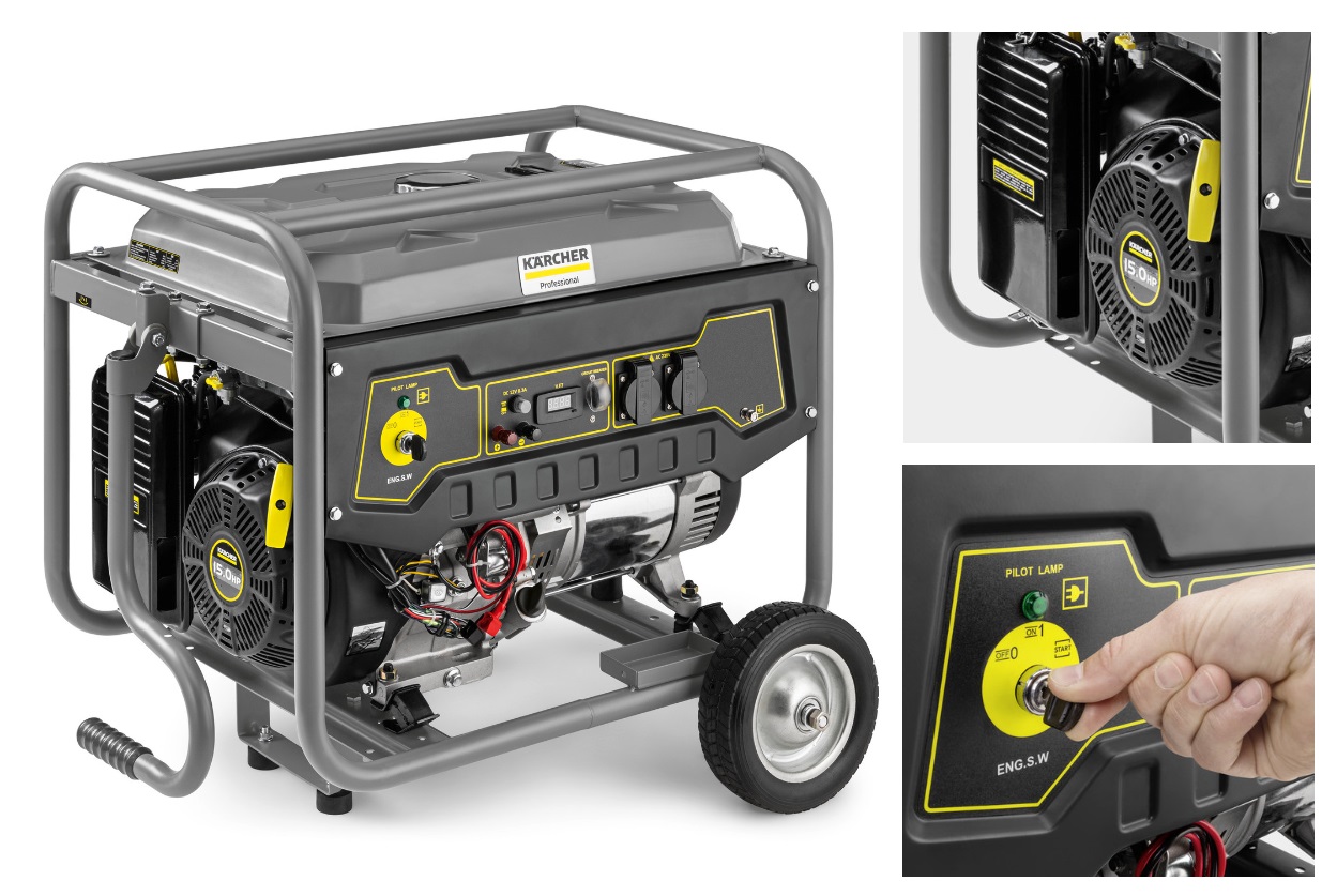 Profi elektrocentrála 7 kW AKCE Kärcher PGG 8/3 pro zásobování střídavým a trojfázovým proudem na stavbách, v zemědělství nebo v obcích. Kärcher PGG 8/3 1.042-209.0 generátor proudu poskytuje trvalý výkon 7 kW (400 V) nebo 2 kW (230 V).