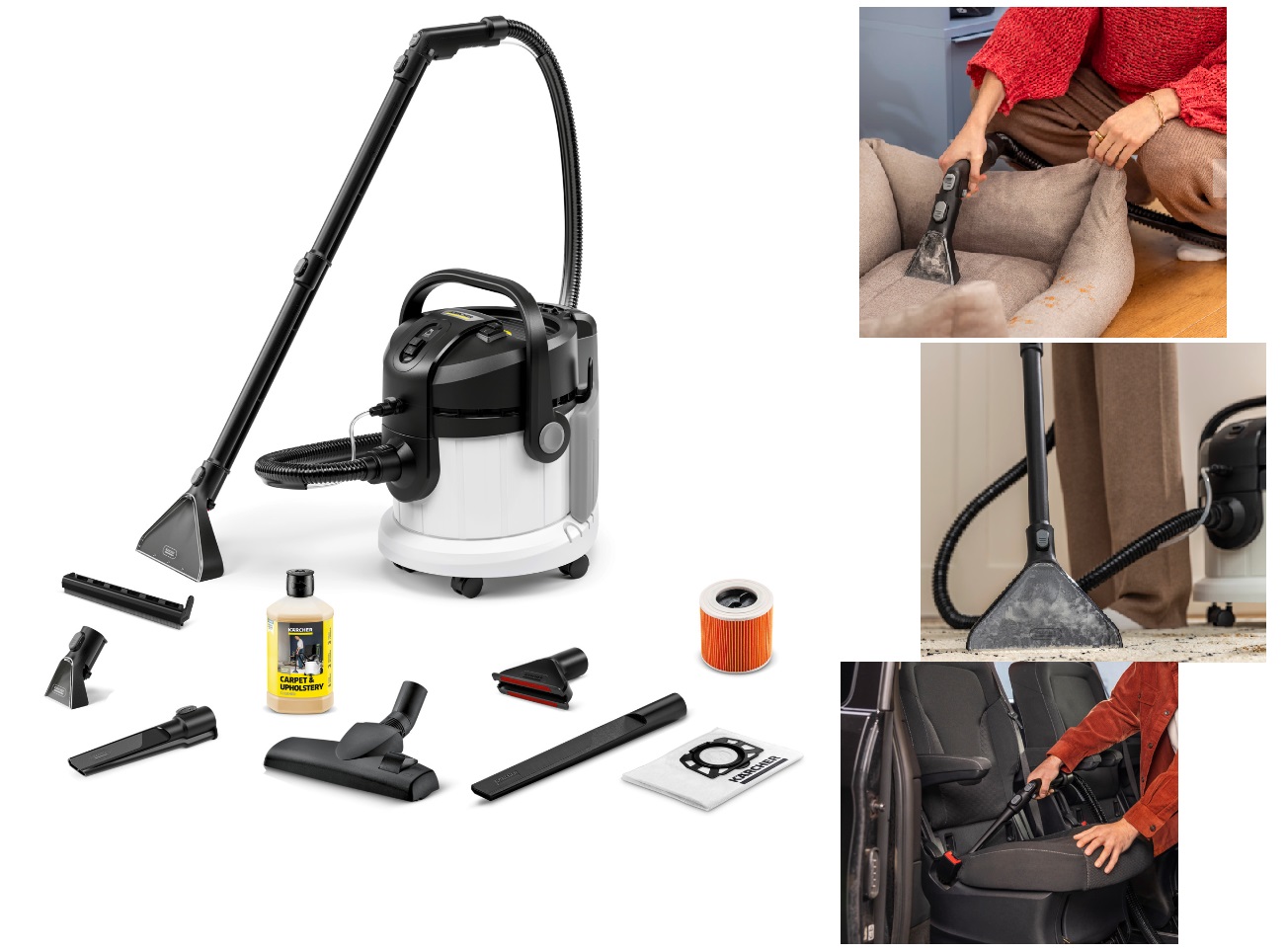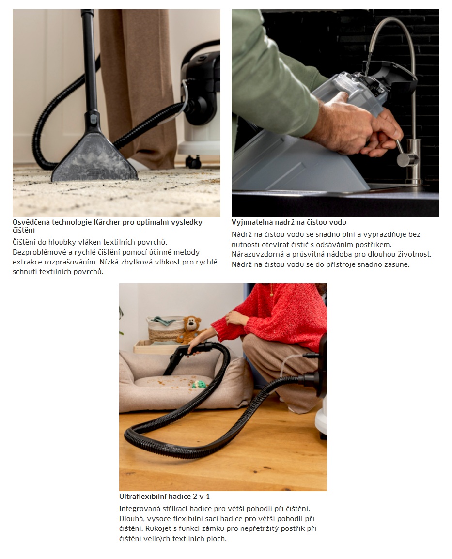 Domácí tepovač na koberce KÄRCHER SE 3 Compact Home 1.081-530.0 je výkonný a energeticky úsporný tepovač hloubkovým čištěním textilních povrchů, jako je čalounění.Domácí tepovač na koberce KÄRCHER SE 3 Compact Home 1.081-530.0 pro koberce a čalounění