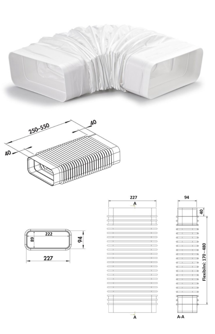 Flexibilní potrubí je vyztuženo spirálovým rámem z ocelového drátu. Obsahuje oboustrannou přípojku na ploché potrubí. Je určeno pro ohyb až do 90°.