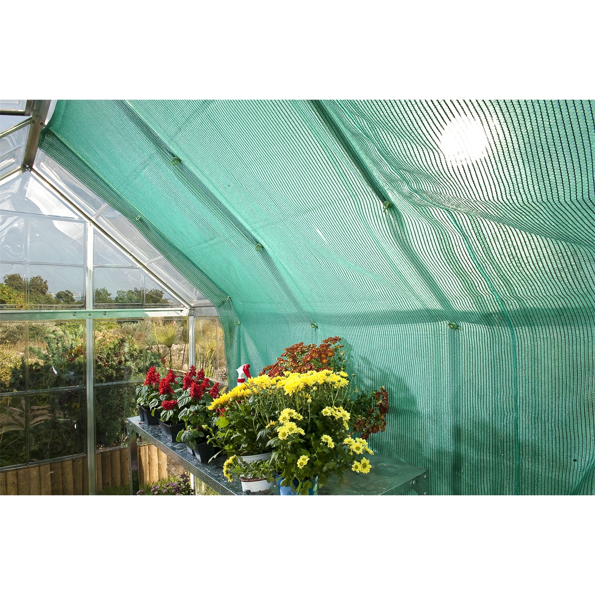 Krycí zástěna pro skleníky Na ochranu rostlin, které nevyžadují přímý sluneční svit nebo na ochranu rostlin přes přílišným horkem, je možné použít lehkou textilní zástěnu, která pohltí až 70% prudkého slunečního záření. Zástěna má rozměr 230 x 265 cm a jednoduchým mechanismem se upne ke stěnám skleníku.