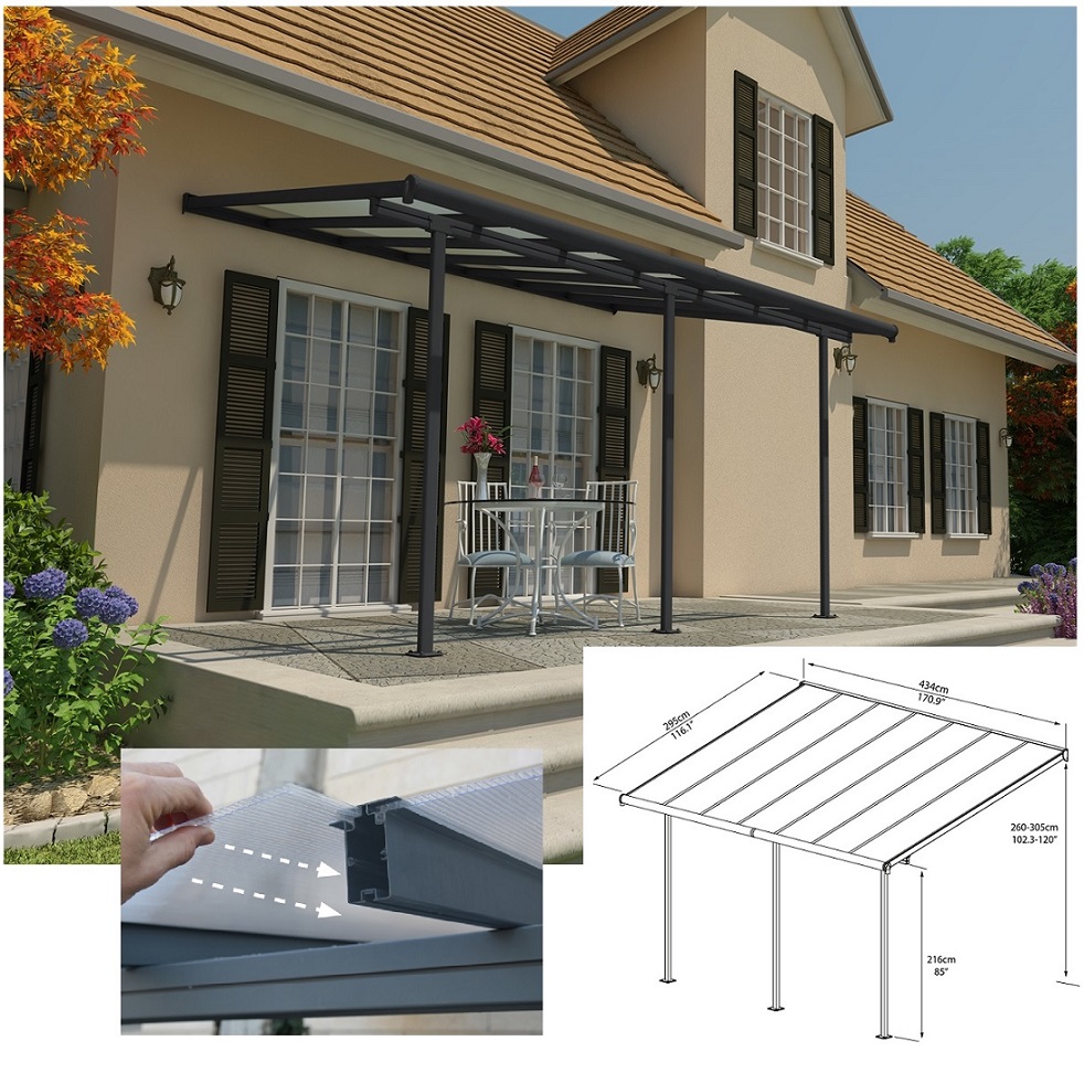 Hliníková pergola ke zdi domu Palram Sierra 3000 antracit za akční cenu s dopravou zdarma. Autorizovaný prodejce, prodloužená záruka a servis ČR, odborné poradenství.
