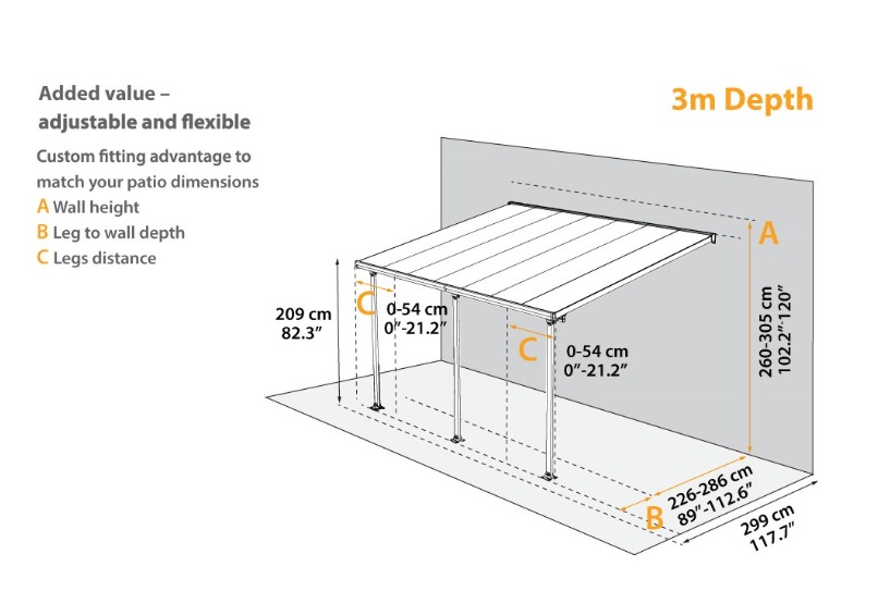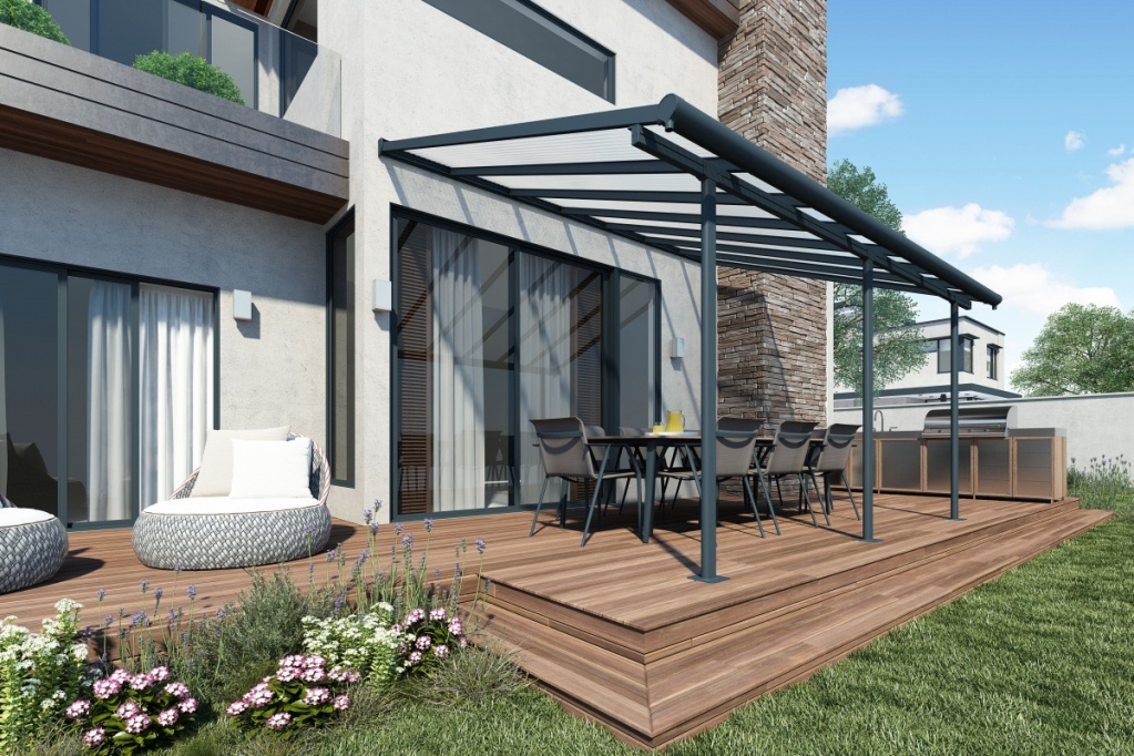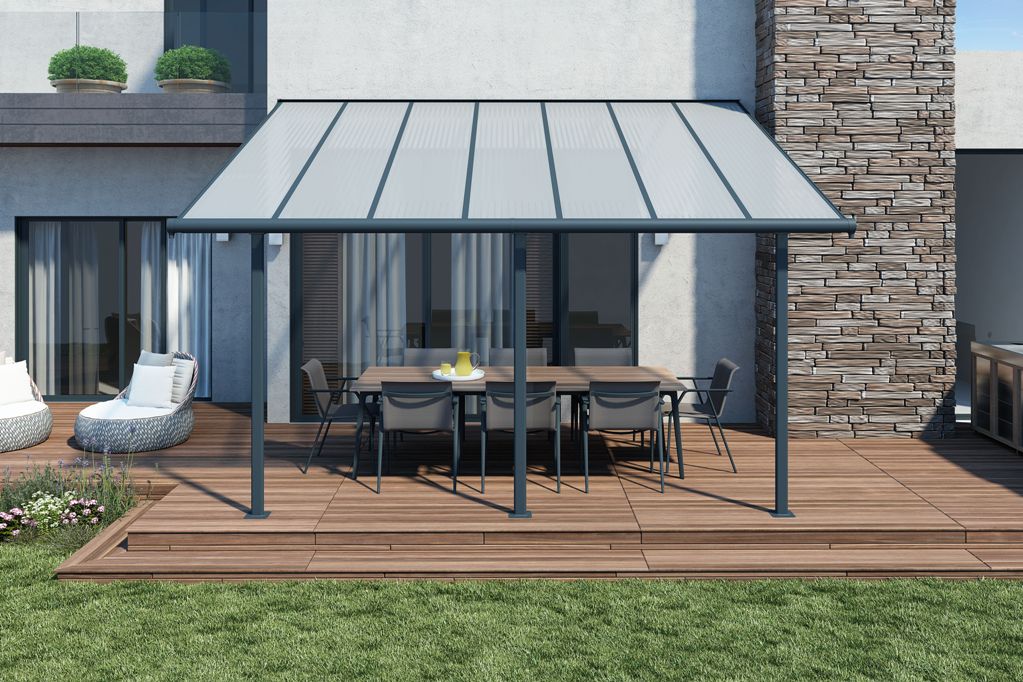 Hliníková pergola ke zdi domu Palram Sierra 3000 antracit za akční cenu s dopravou zdarma. Autorizovaný prodejce, prodloužená záruka a servis ČR, odborné poradenství.